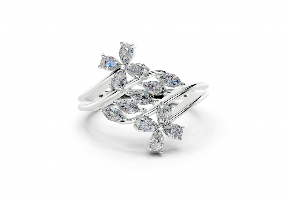 14K white gold ring with 0.41 ct. Pear diamonds and 0.19 ct. Round diamonds. Ring weight is approximately 3.50 grams. Go to "Specifications" for more details about this product.