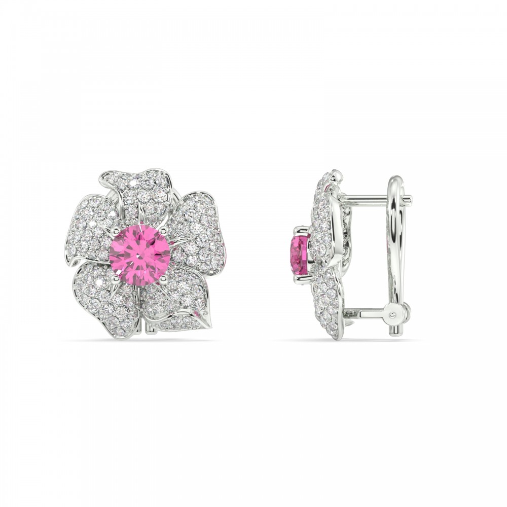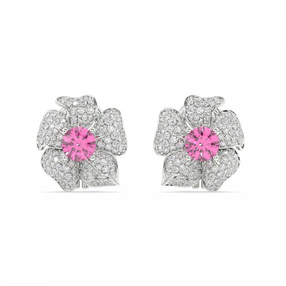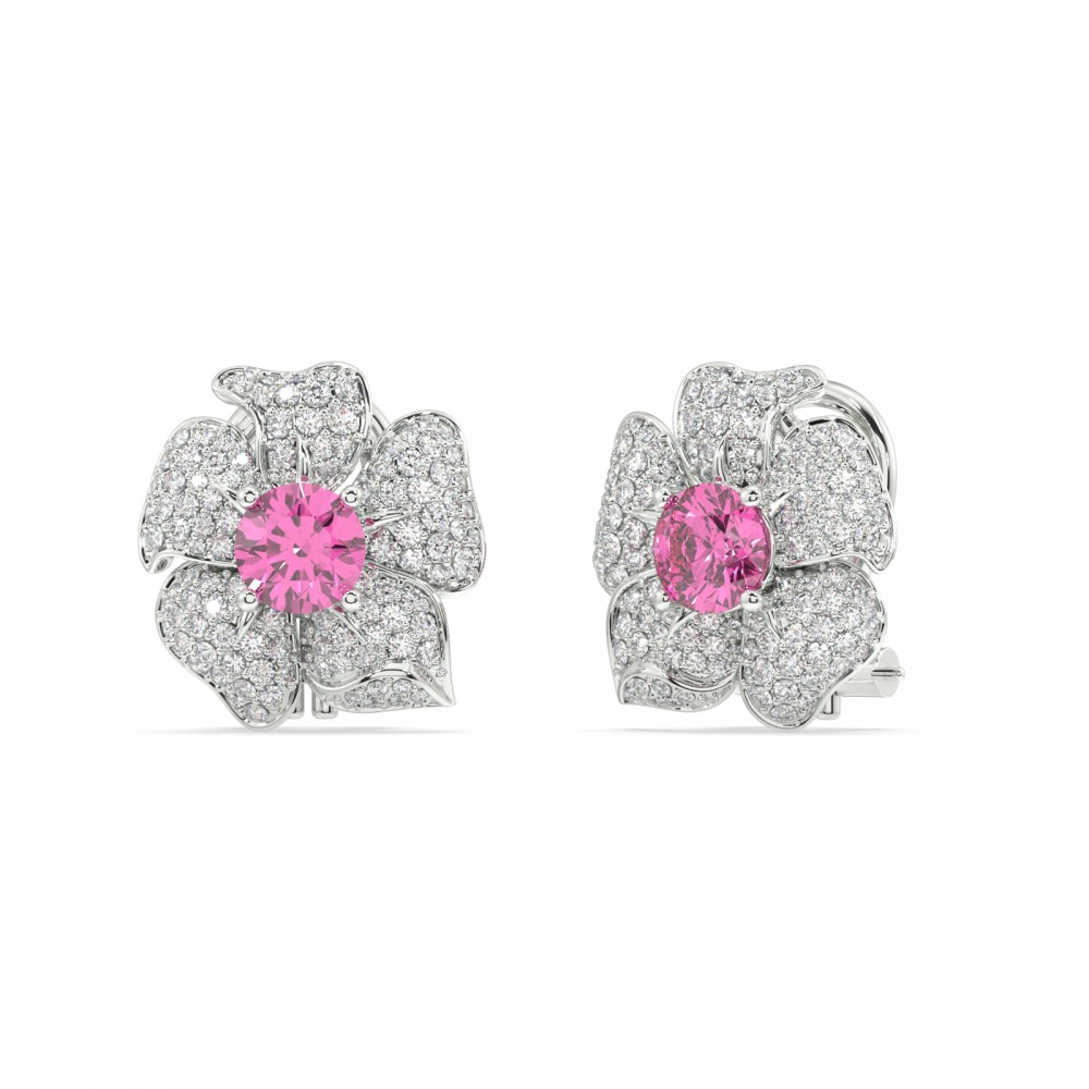 14K white gold earrings with 1.83 ct. diamonds and 2.00 ct. pink sapphires. The weight of the earrings is 7.47 grams.