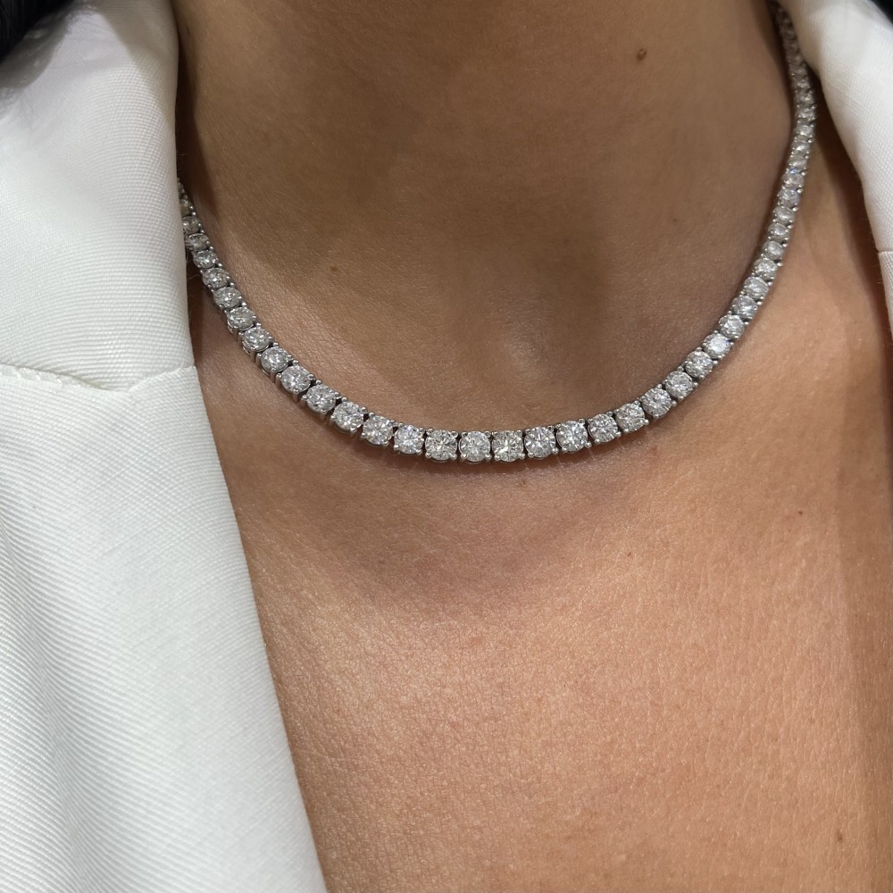 14K white gold tennis necklace with 10.09 ct diamonds. The weight of the necklace is approximately 31.64 gr.