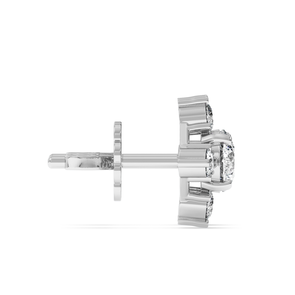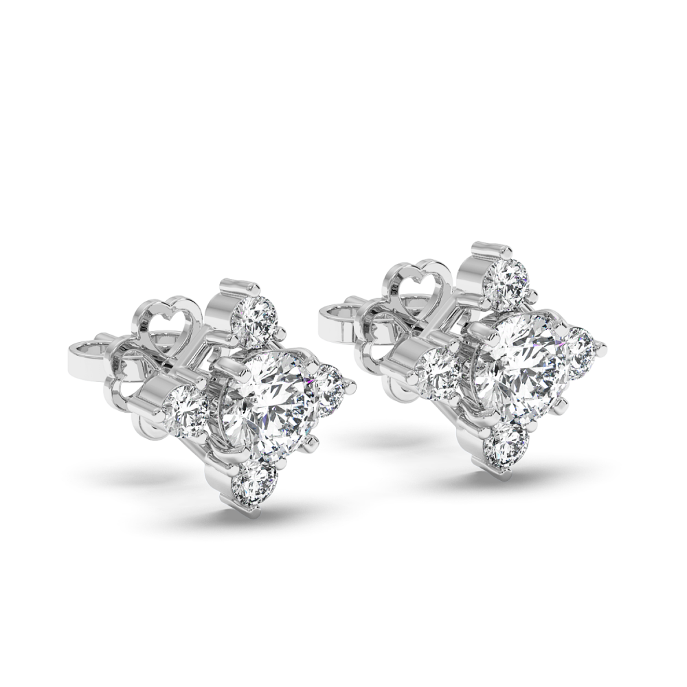 Cercei din aur alb de 14 K, cu diamant central fiecare de 0.25 ct. si diamante laterale de 0.21 ct. Greutatea aproximativa a cerceilor este de 2.37 grame. Lungimea cerceilor este de 9 mm.