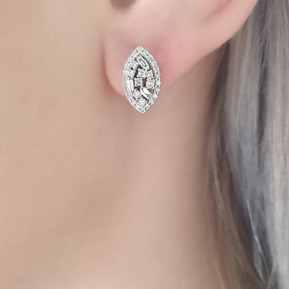 Cercei cu diamante din aur alb de 14 K cu diamante bagheta de 0.08 ct si diamante de 0.31 ct. Greutatea cerceilor este de 2.30 grame.