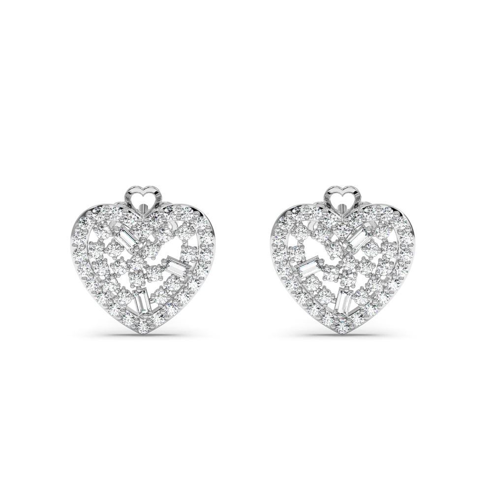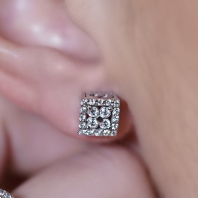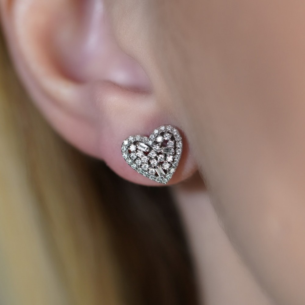 Cercei din aur alb de 14 K, cu diamante bagheta de 0.08 ct si diamante rotunde de 0.41 ct. Greutatea cerceilor este de 2.97 grame.