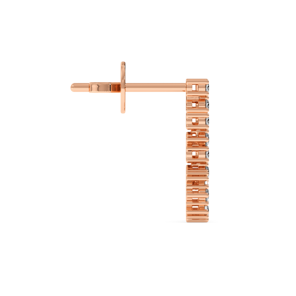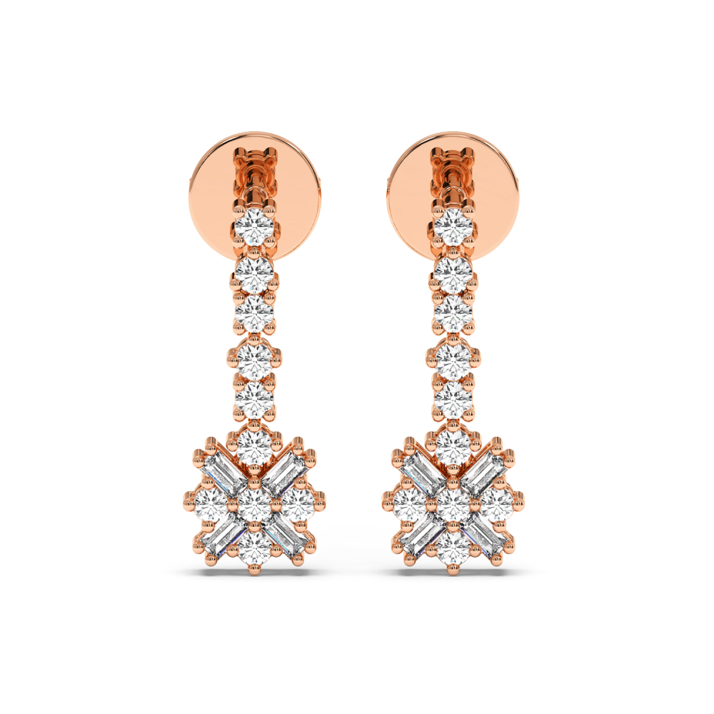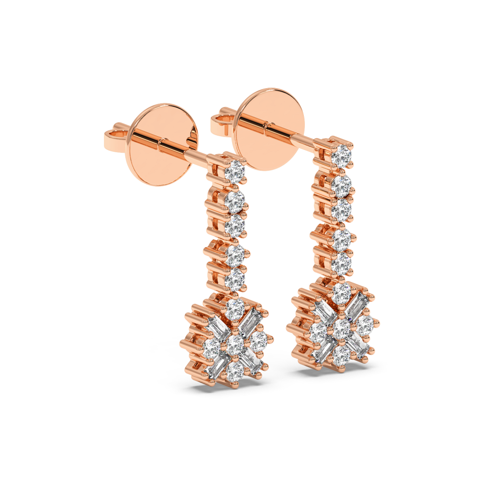 Cercei din aur de 14 K, cu diamante baget de 0.08ct si diamante rotunde de 0.15ct. Greutatea cerceilor este de aproximativ 2 grame.   Accesati "SPECIFICATII" pentru mai multe detalii despre acest produs.