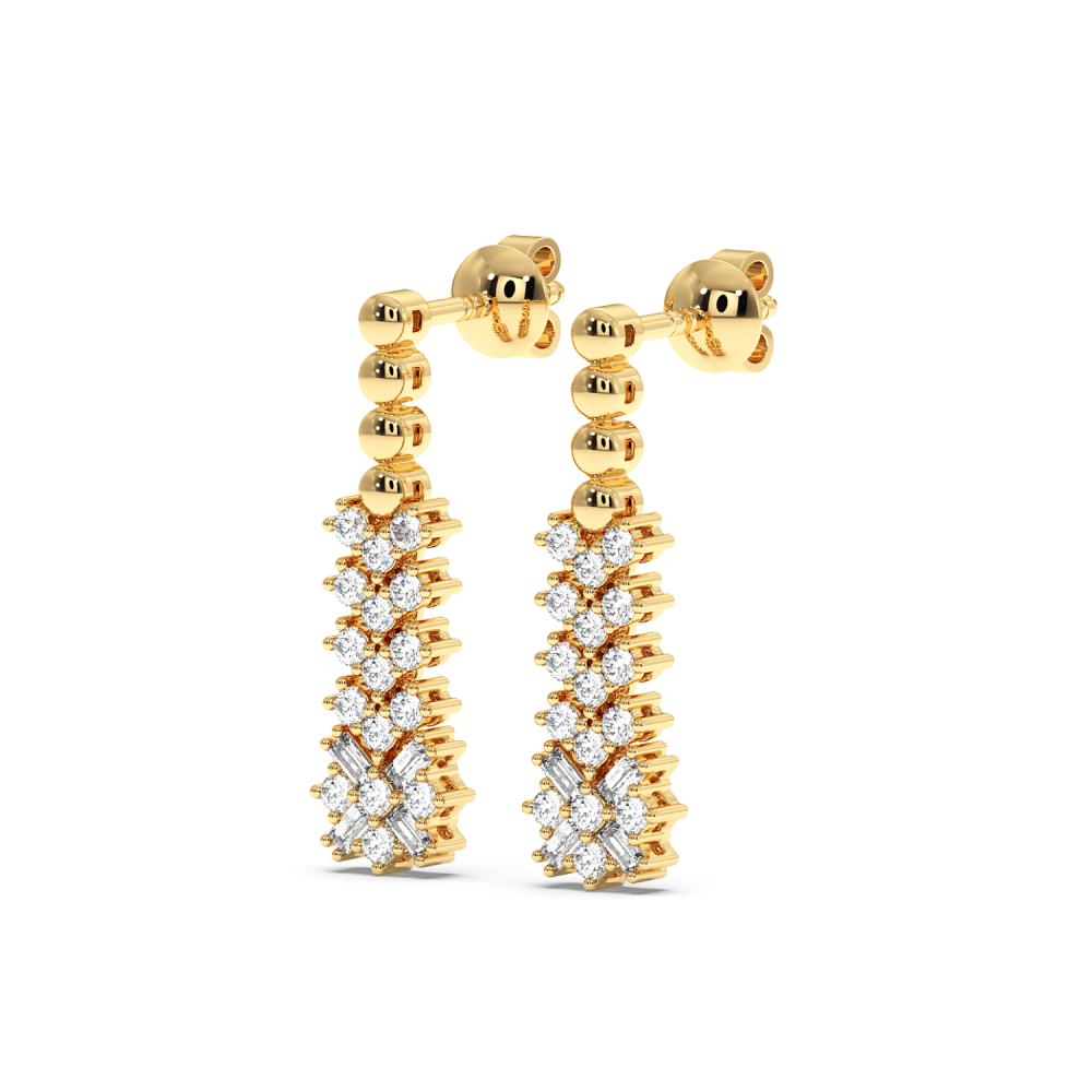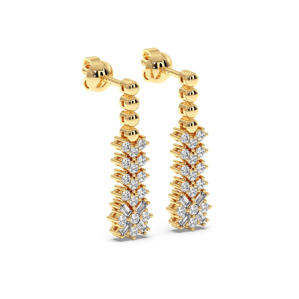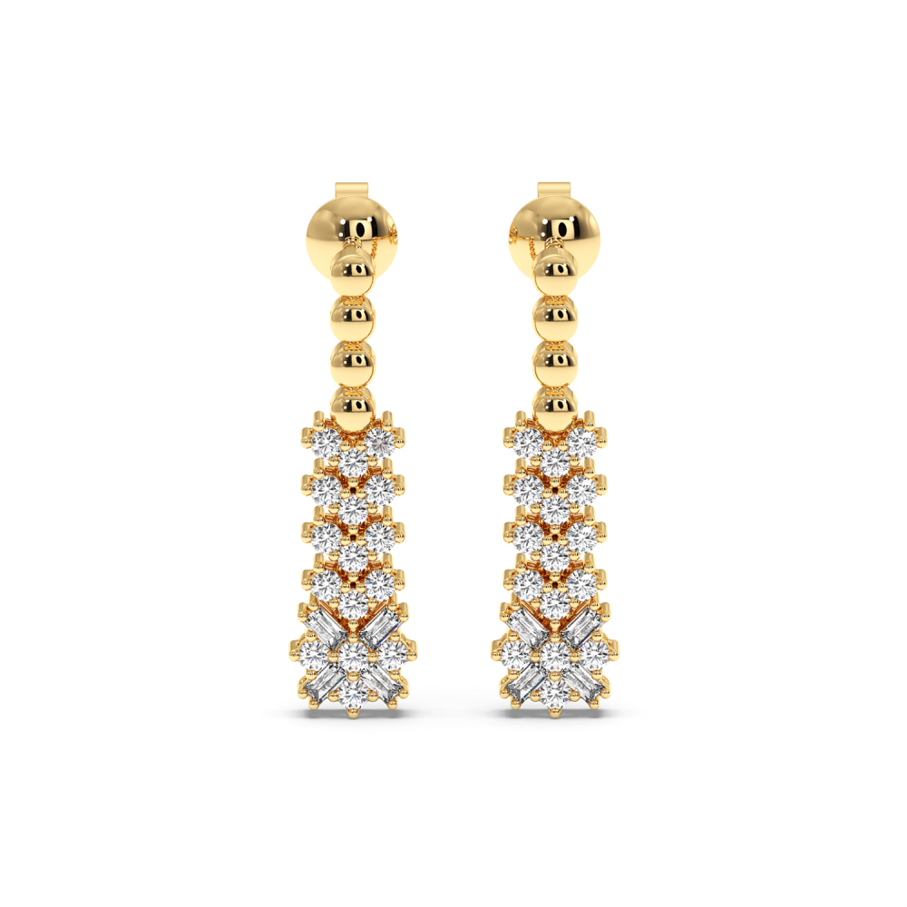 Cercei din aur de 14 K, cu diamante baget de 0.08ct si diamante rotunde de 0.25ct. Greutatea cerceilor este de aproximativ 2.4 grame. Accesati "SPECIFICATII" pentru mai multe detalii despre acest produs.