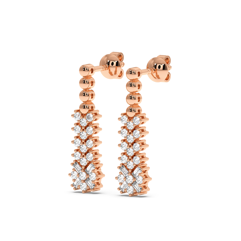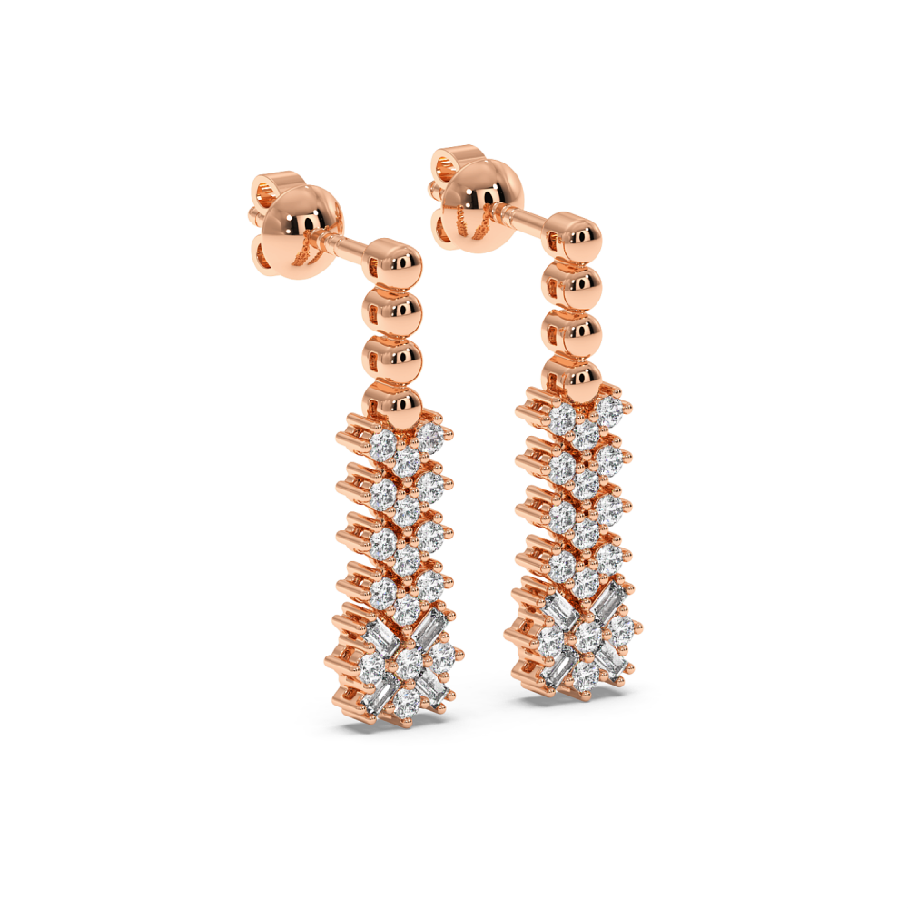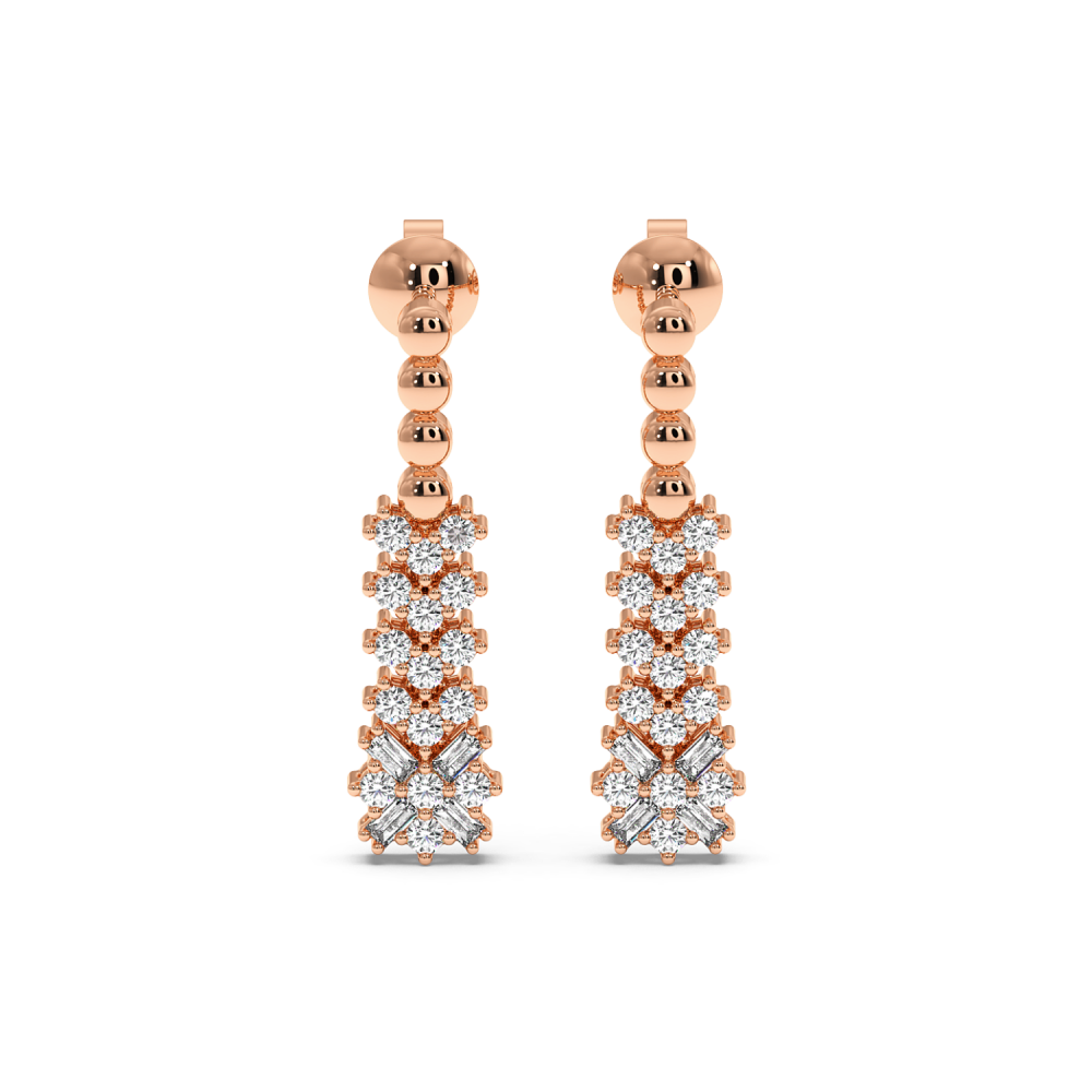 Cercei din aur de 14 K, cu diamante baget de 0.08ct si diamante rotunde de 0.25ct. Greutatea cerceilor este de aproximativ 2.4 grame. Accesati "SPECIFICATII" pentru mai multe detalii despre acest produs.