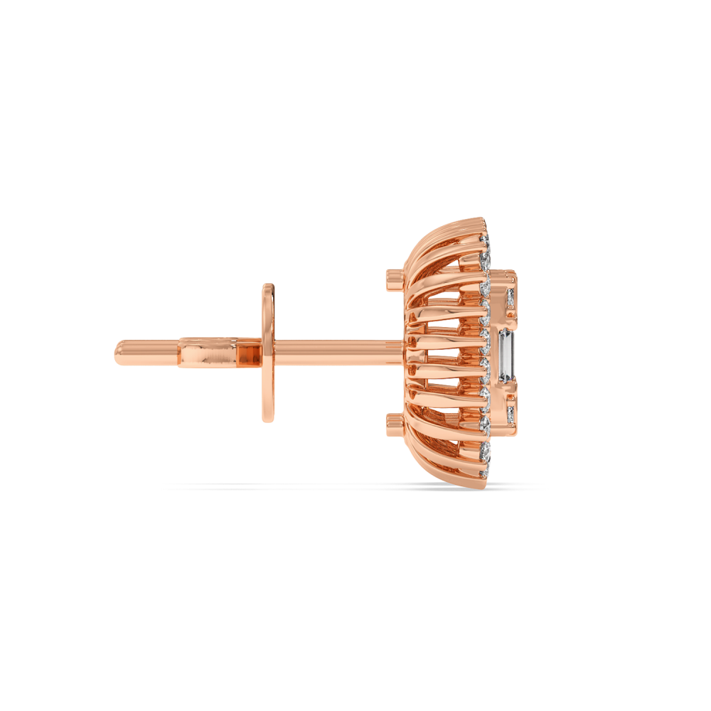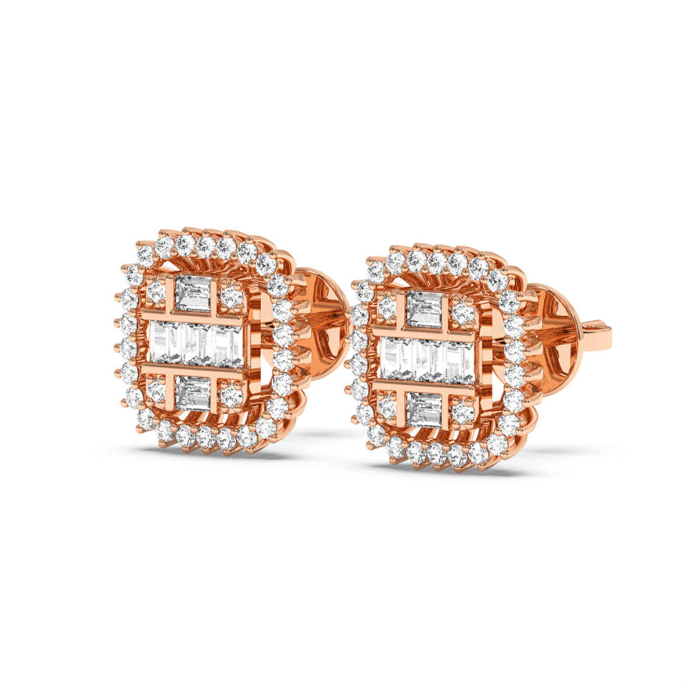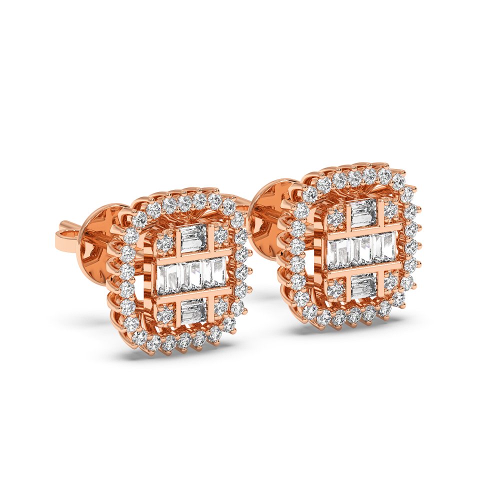 Cercei cu aur alb de 14 K, cu diamante Baget de 0.11 ct si diamante rotunde de 0.25 ct. Greutatea cerceilor este de 2.19 grame.