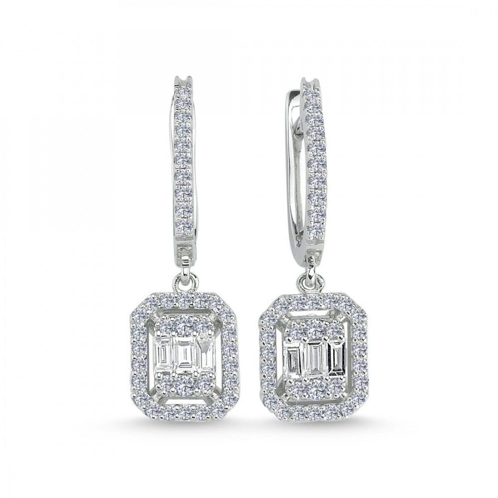 Cercei din aur alb de 14 K, cu diamante Baget de 0.16 ct si diamante rotunde de 0.41 ct. Greutatea cerceilor este de aproximativ 3.33 grame.