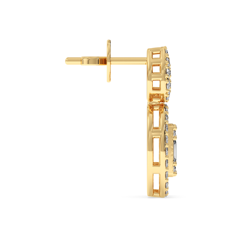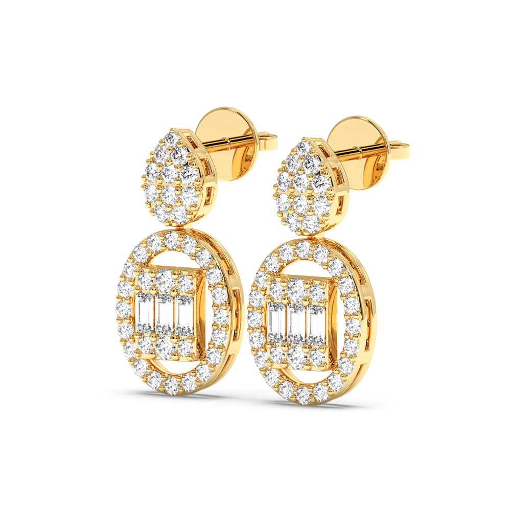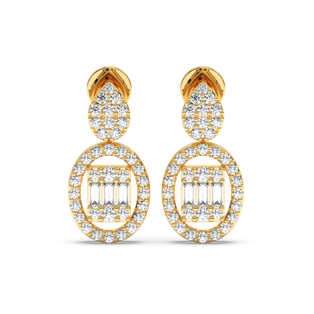 Cercei din aur de 14 K, cu diamante baget de 0.16ct si diamante rotunde de 0.53ct. Greutatea cerceilor este de aproximativ 3.10 grame. Accesati "SPECIFICATII" pentru mai multe detalii despre acest produs.
