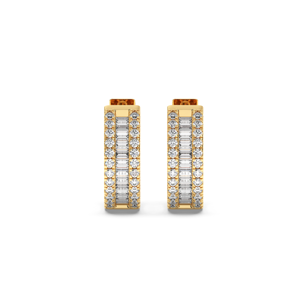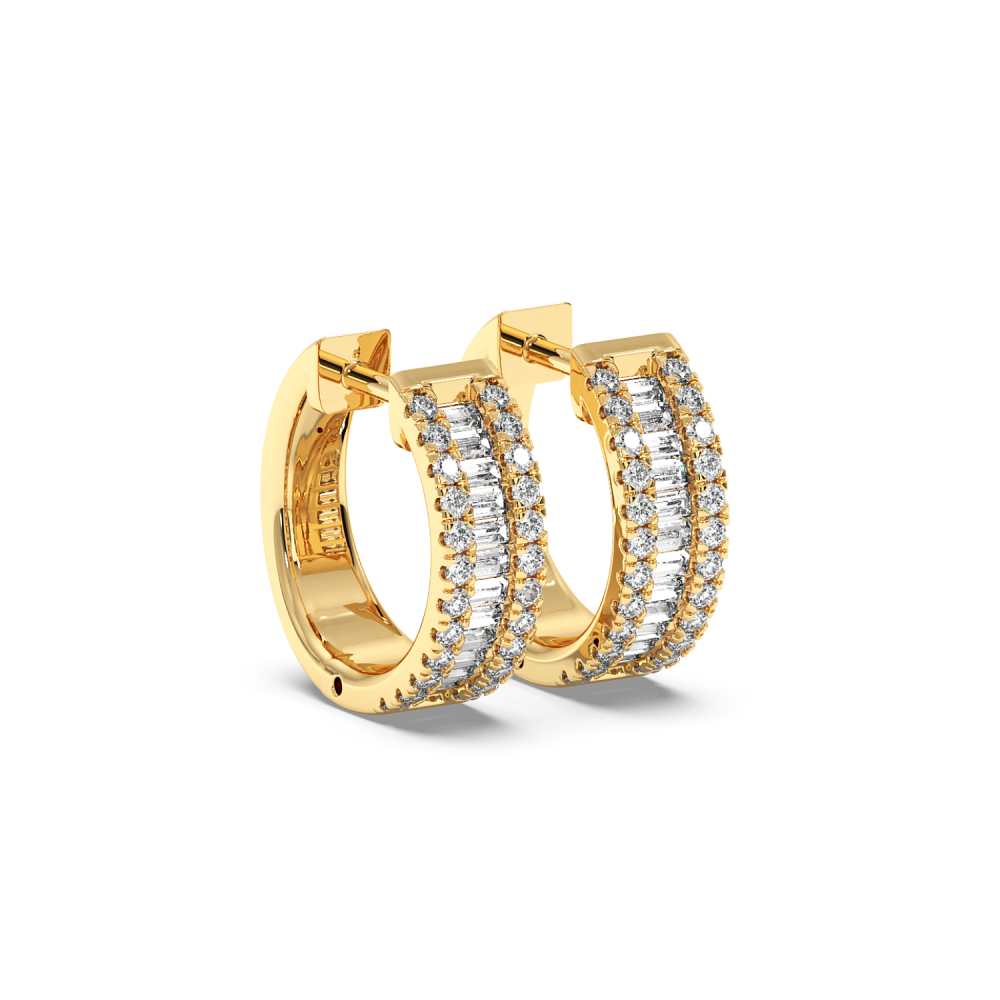 Cercei din aur de 14 K, cu diamante Baget de 0.21ct si diamante rotunde de 0.24ct. Greutatea cerceilor este de aproximativ 3.10 grame.