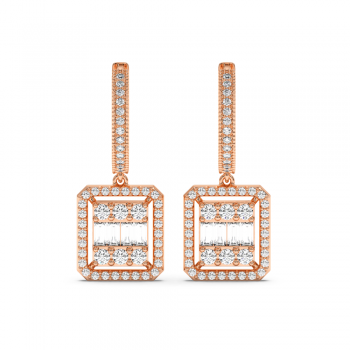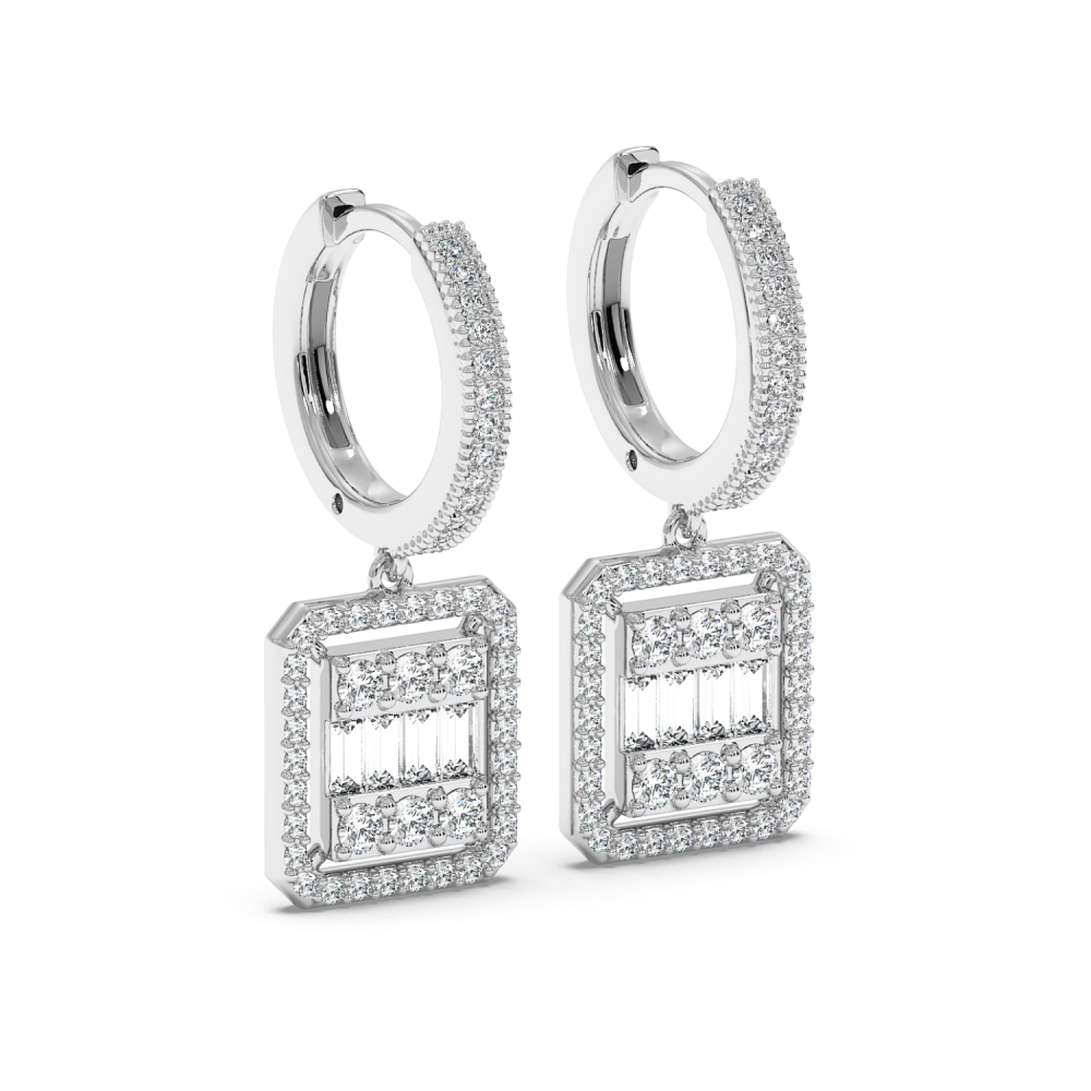 Cercei din aur alb de 14 K, cu diamante baget de 0.24 ct si diamante rotunde de 0.78. Greutatea cerceilor este de 5.88 grame.