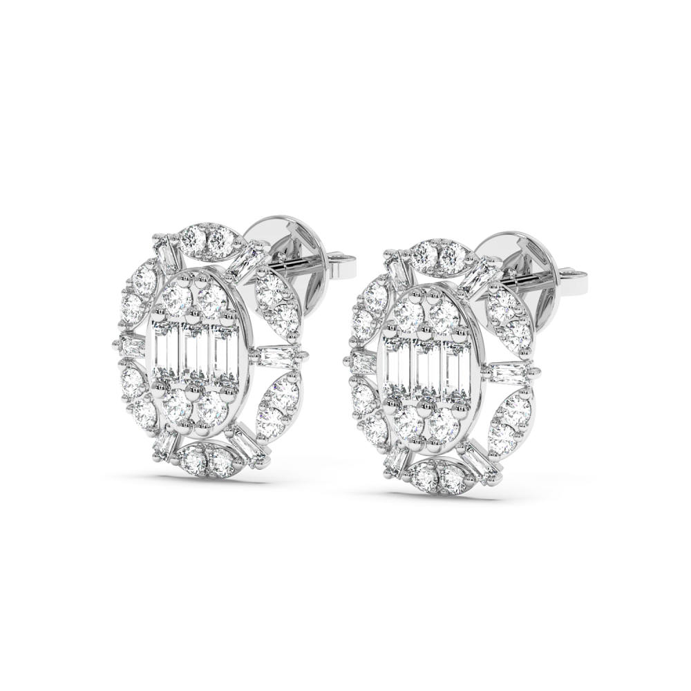 Cercei din aur de 14 K, cu diamante baget de 0.26ct si diamante rotunde de 0.35ct. Greutatea cerceilor este de aproximativ 3 grame.