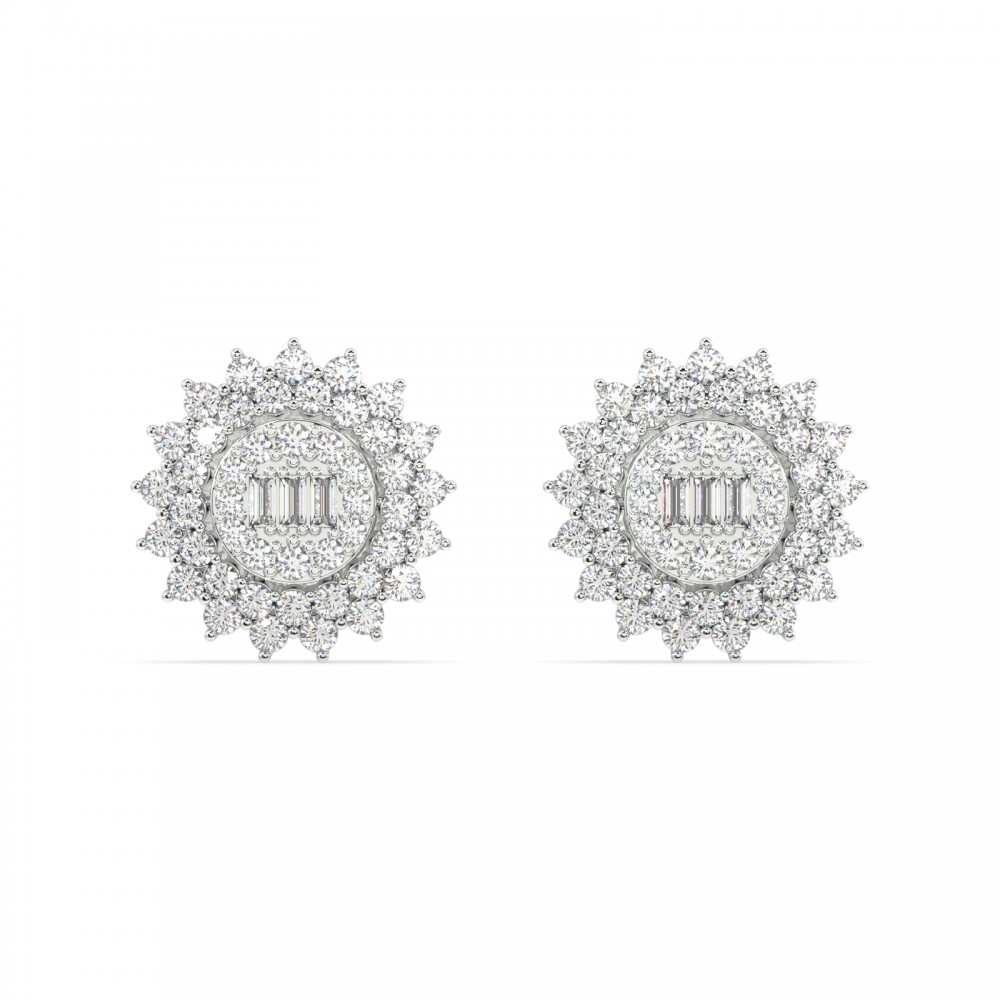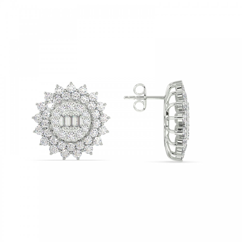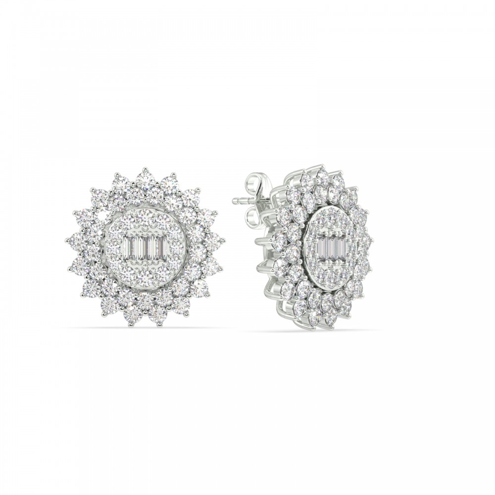 Cercei din aur alb de 14 K, cu diamante de baget de 0.27 ct si diamante round de 2.5 ct. Greutatea cerceilor este de aproximativ 6.94 grame. Cerceii se pot face la comanda si din aur de 18k. Accesati "SPECIFICATII" pentru mai multe detalii despre acest produs. ...