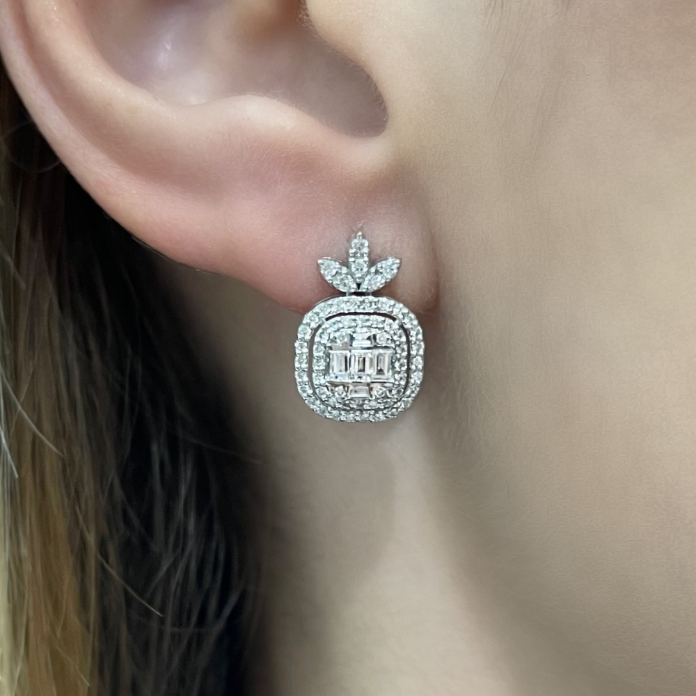 Cercei din aur alb de 14K cu diamante de bagheta de 0.31 ct si diamante round de 0.49 ct. Greutatea cerceilor este de aproximativ 3.58 grame.