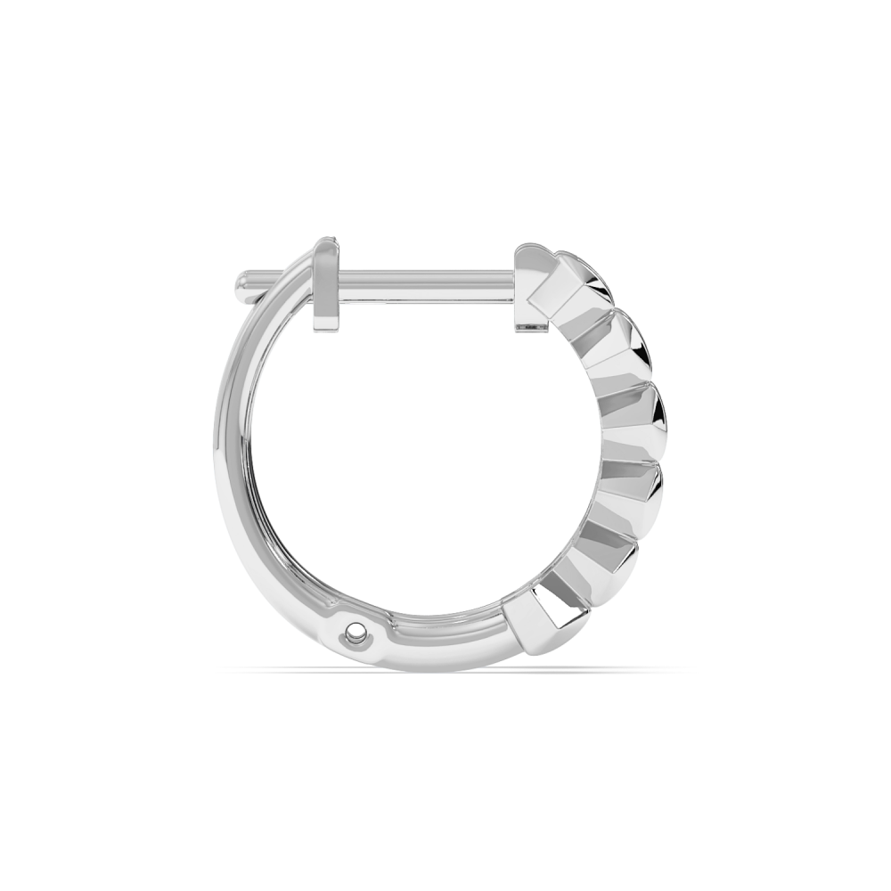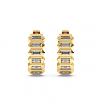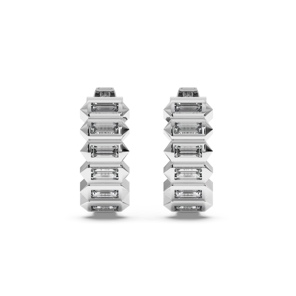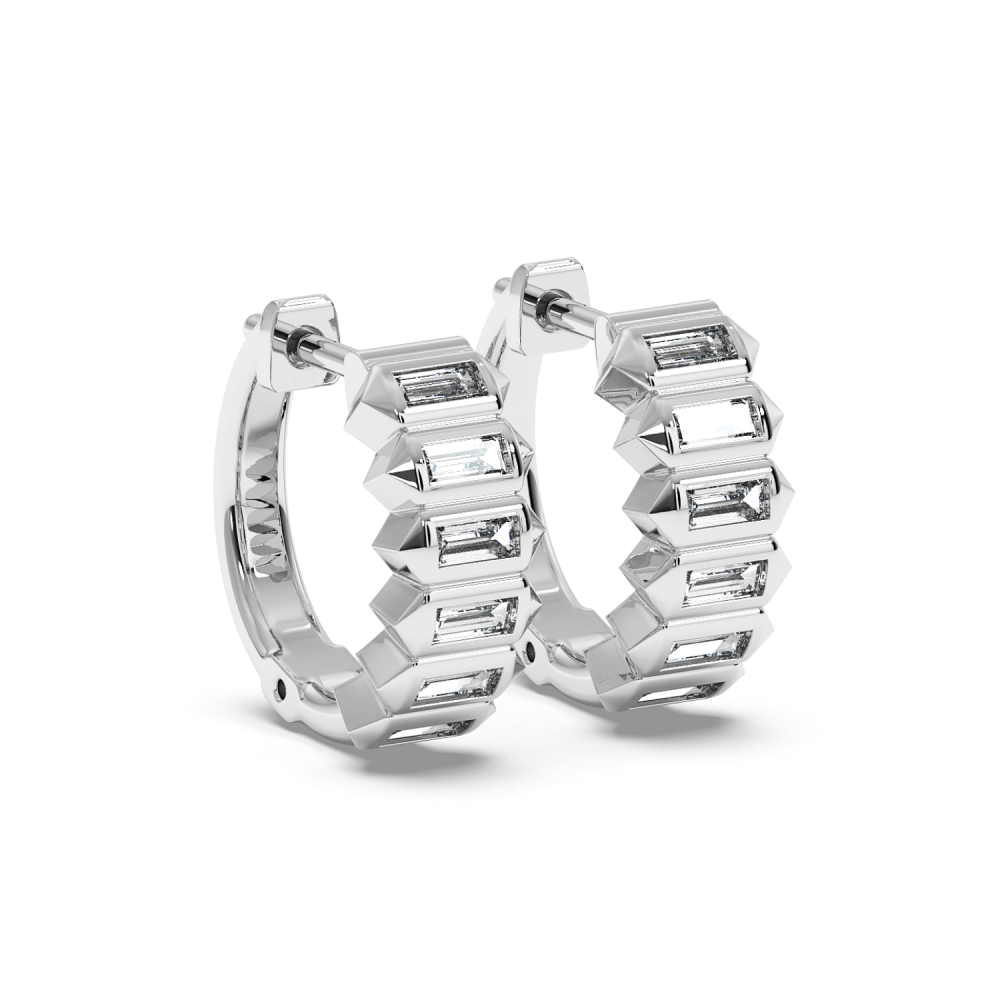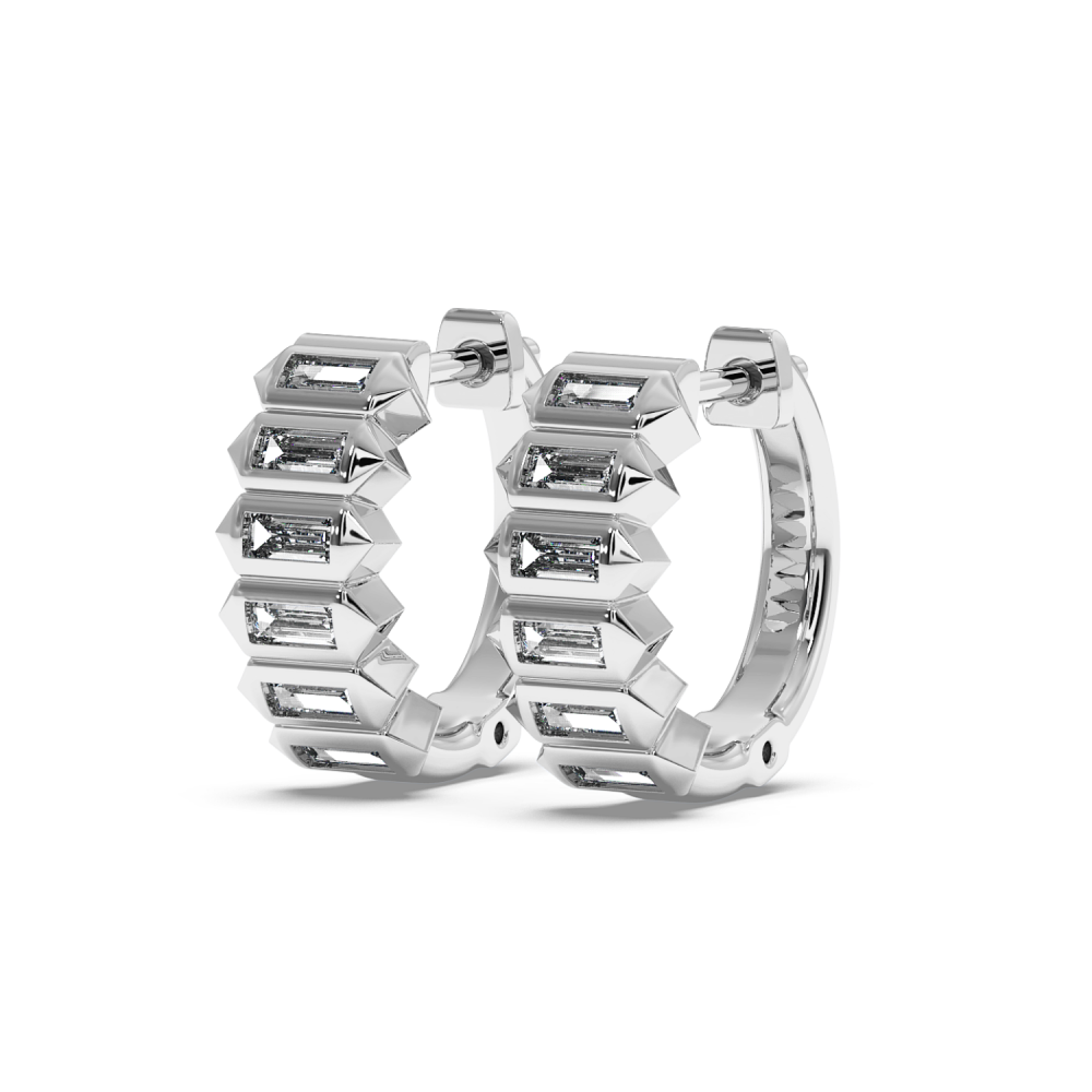 Cercei din aur alb de 14 K, cu diamante baget de 0.43 ct. Greutatea cerceilor este de aproximativ 4.2 grame. Circumferinta cerceilor este de 1.3 cm