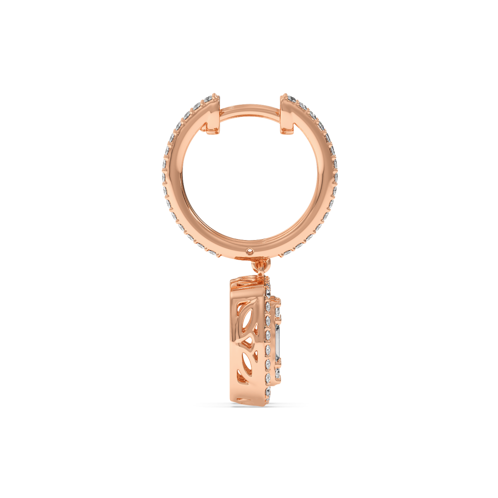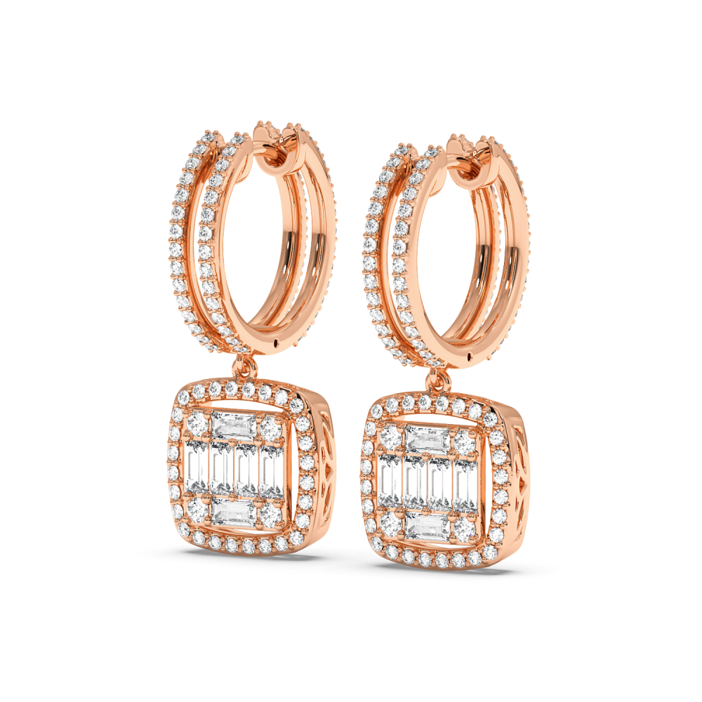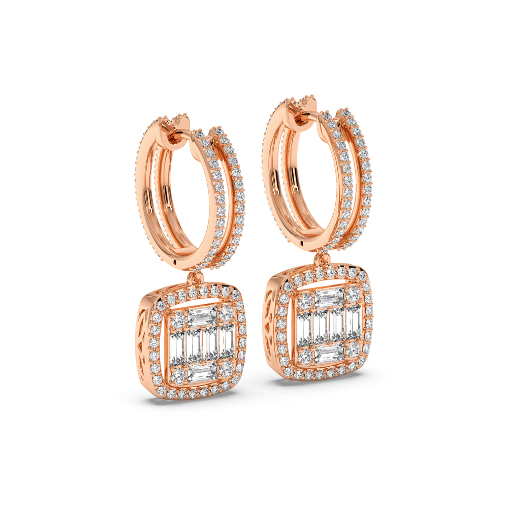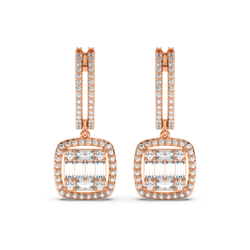 Cercei din aur de 14 K, cu diamante baget de 0.49ct si diamante rotunde de 1.05ct. Greutatea cerceilor este de aproximativ 8 grame.