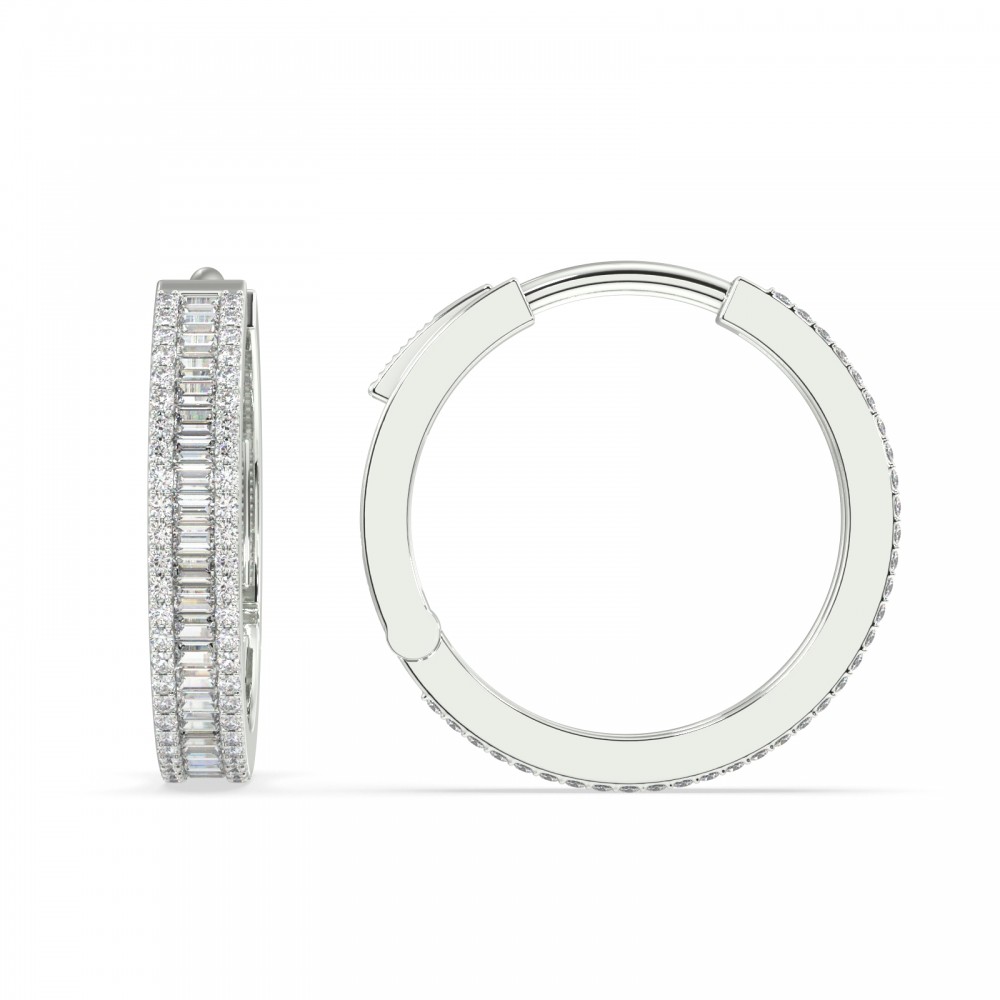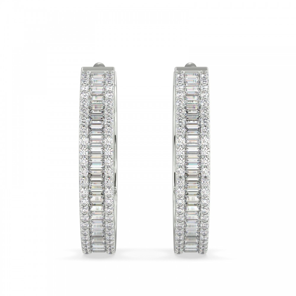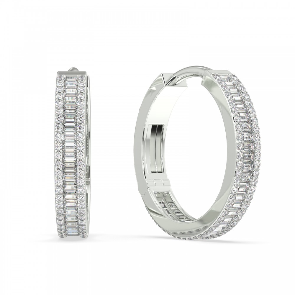 Cercei cu diamante din aur alb de 14 K cu diamante Baget de 0.61 ct si diamante rotunde de 0.83 ct. Greutatea cerceilor este de 5.85 grame. Diametru interior este de 1.6 cm.