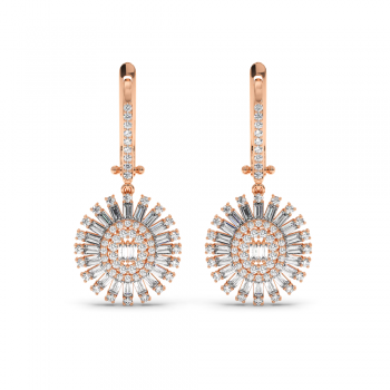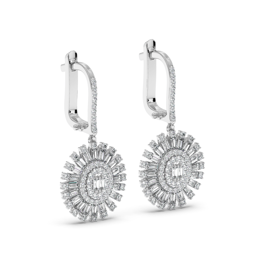 Cercei din aur de 14 K, cu diamante baget de 1.3ct si diamante rotunde de 0.99ct. Greutatea cerceilor este de aproximativ 9.20 grame.