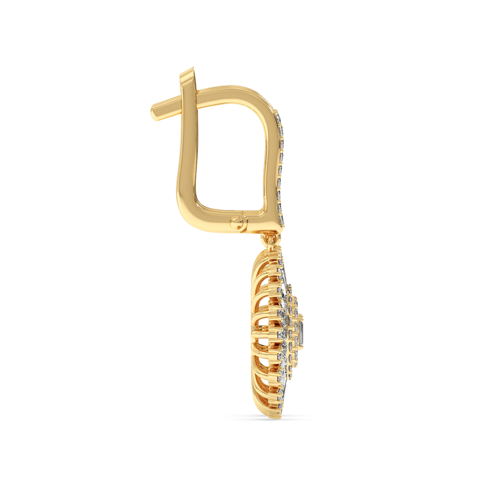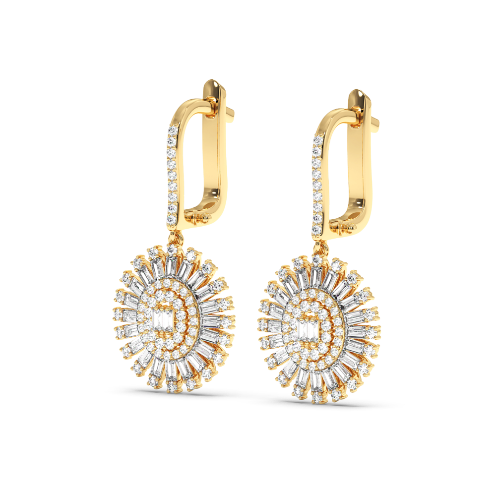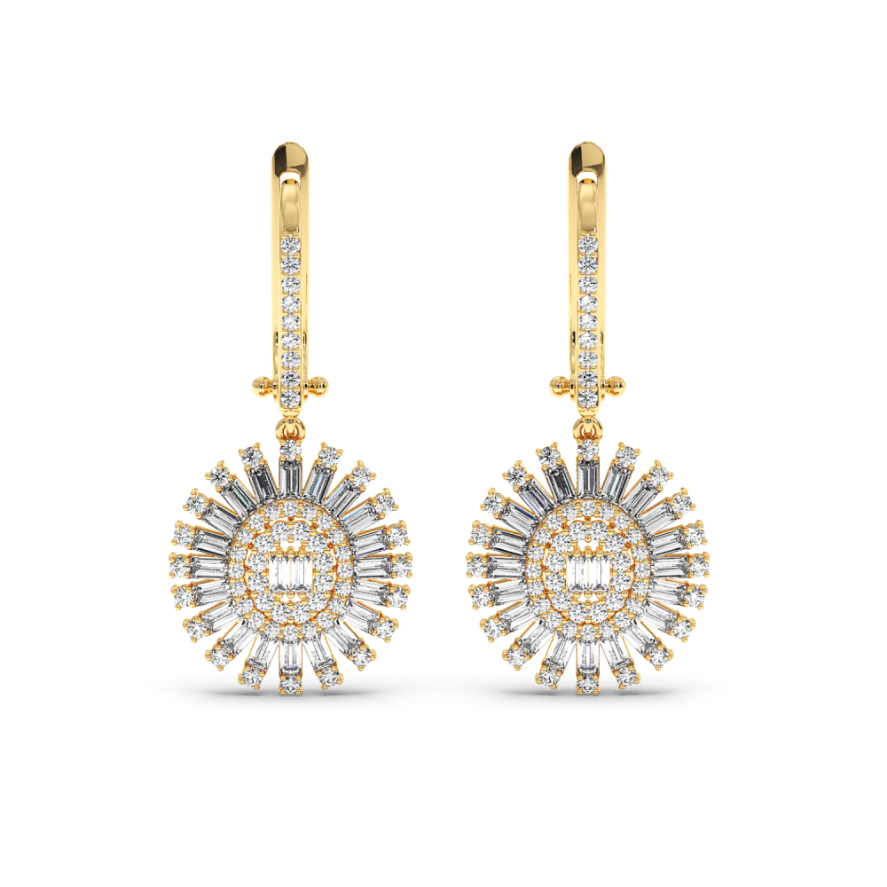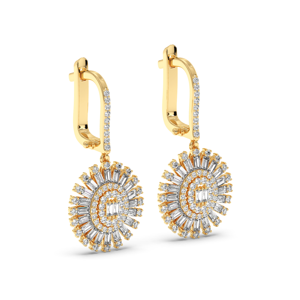 Cercei din aur de 14 K, cu diamante baget de 1.3ct si diamante rotunde de 0.99ct. Greutatea cerceilor este de aproximativ 9.20 grame. Accesati "SPECIFICATII" pentru mai multe detalii despre acest produs.