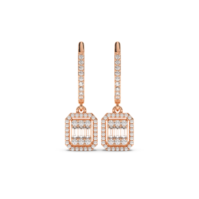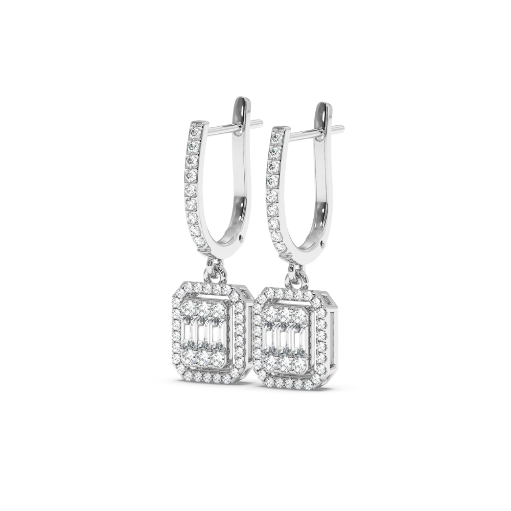 Cercei din aur alb de 14 K, cu diamante bagheta de 0.15 si diamante rotunde de 0.46 ct. Greutatea cerceilor este de 3.80 grame. CErceii se pot realiza din aur galben, alb sau rose.
