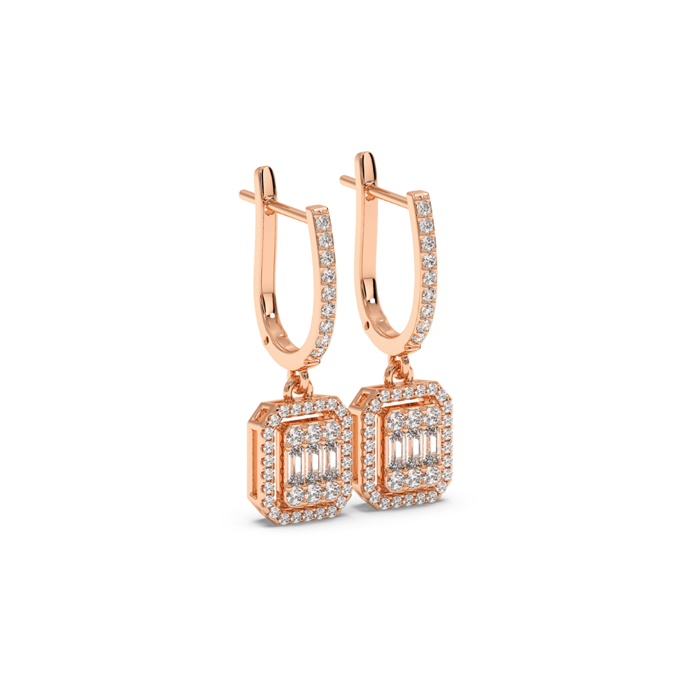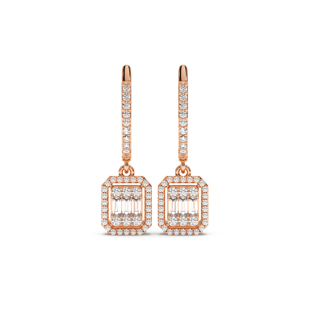 Cercei din aur alb de 14 K, cu diamante bagheta de 0.15 si diamante rotunde de 0.46 ct. Greutatea cerceilor este de 3.80 grame. CErceii se pot realiza din aur galben, alb sau rose.