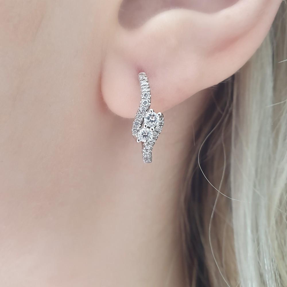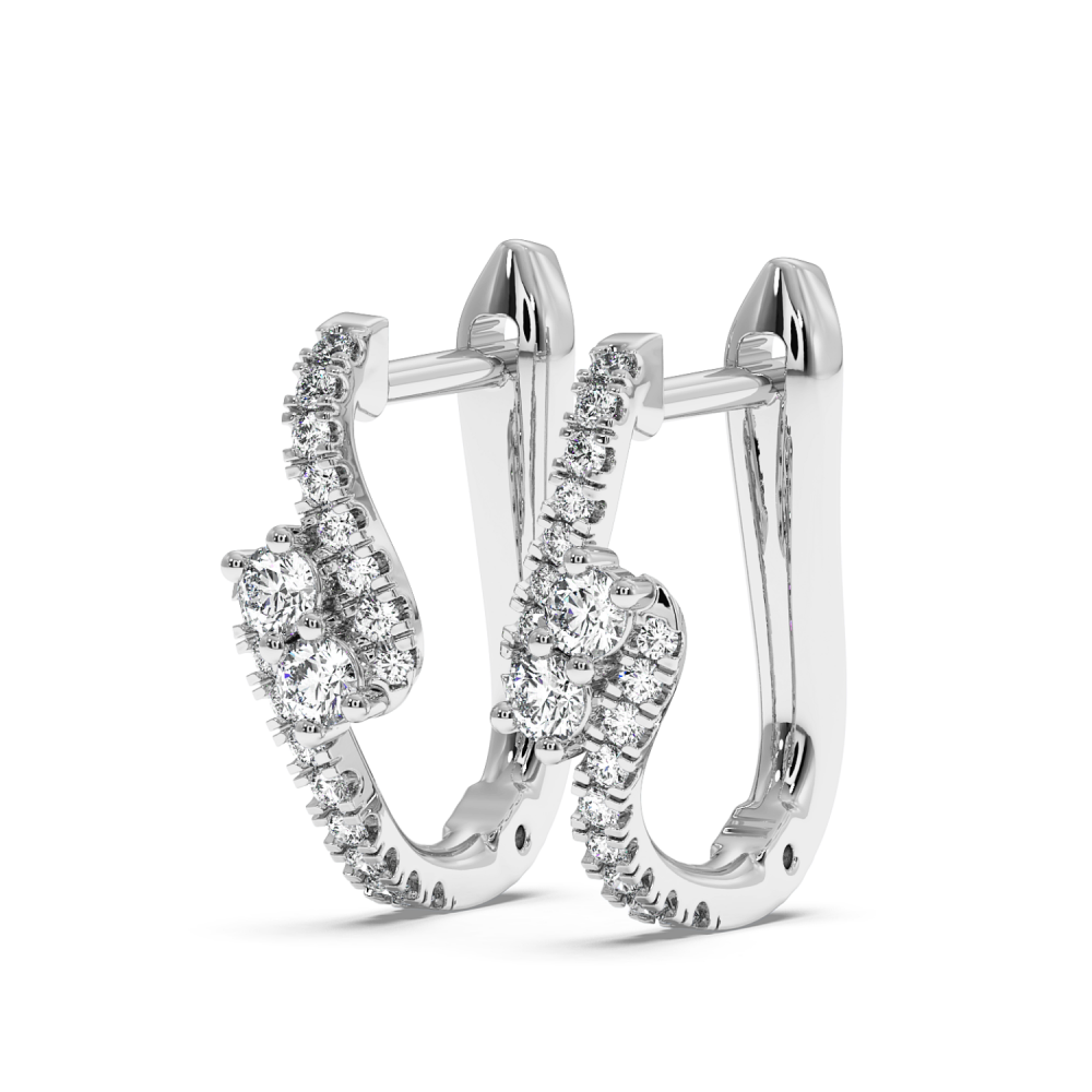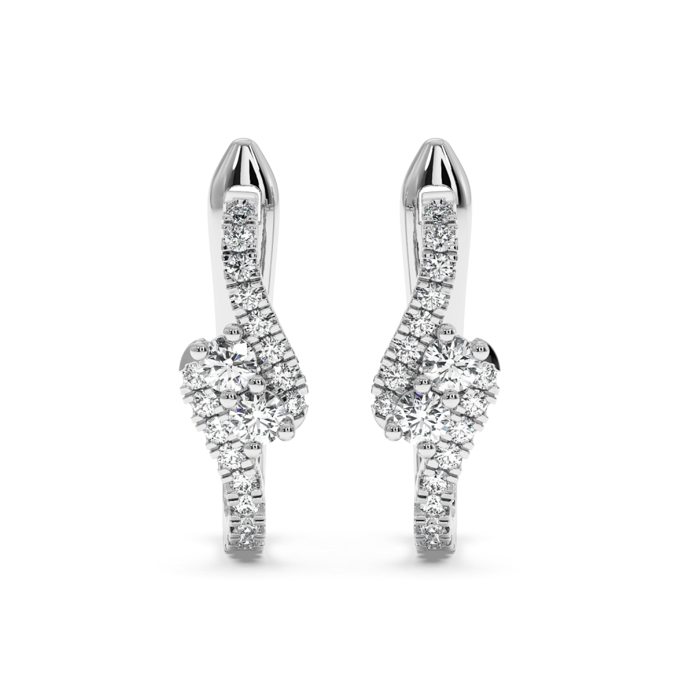 Cercei cu aur alb de 18 K, cu diamante centrale de 0.16 ct si diamante laterale de 0.20 ct. Greutatea cerceilor este de 2.55 grame.