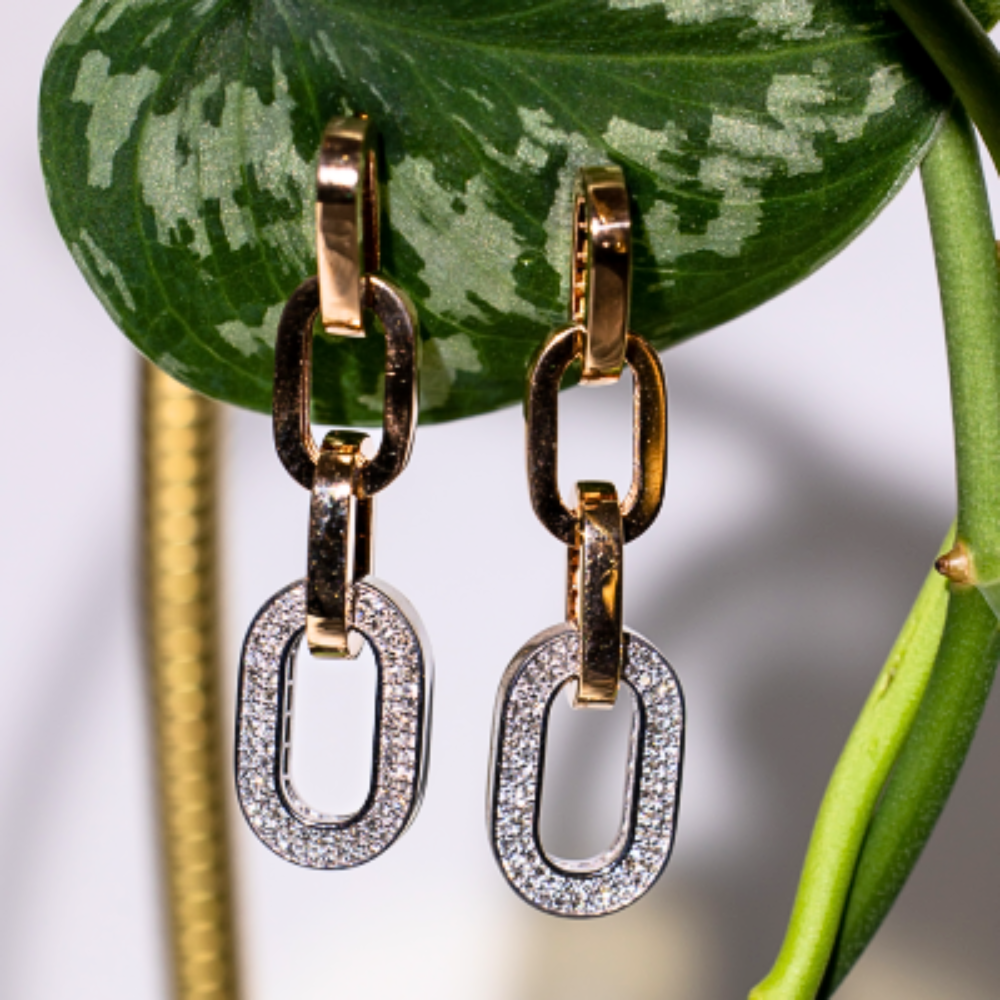 Cercei din aur alb si rose de 18K, cu diamante round de 1.25 ct. Greutatea cerceilor este de 13.60 grame.