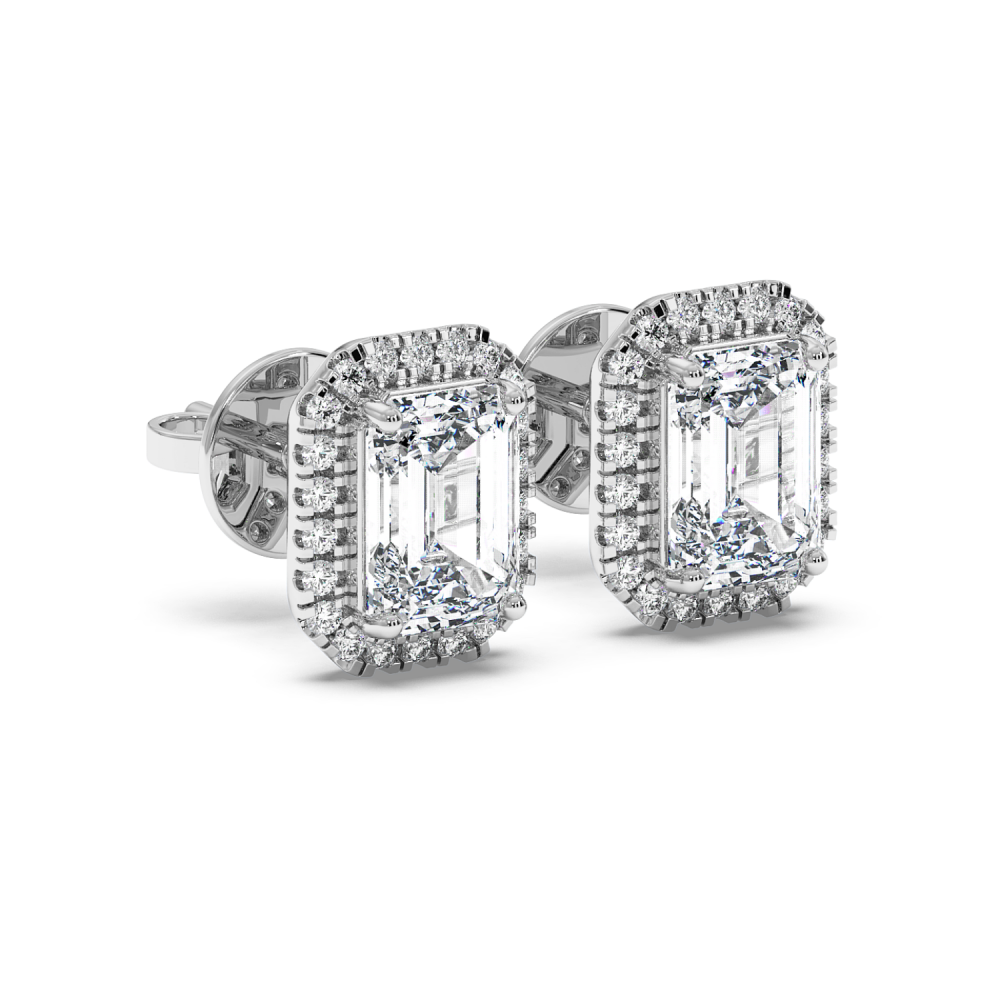 Cercei din aur alb de 14k, diamante emerald de 1.30 ct (0.65 ct fiecare). si diamante rotunde de 0.26 ct. Greutatea aproximativa a cerceilor este de apx 2.90 grame. Cerceii se pot confectiona din aur alb , galben sau rose.