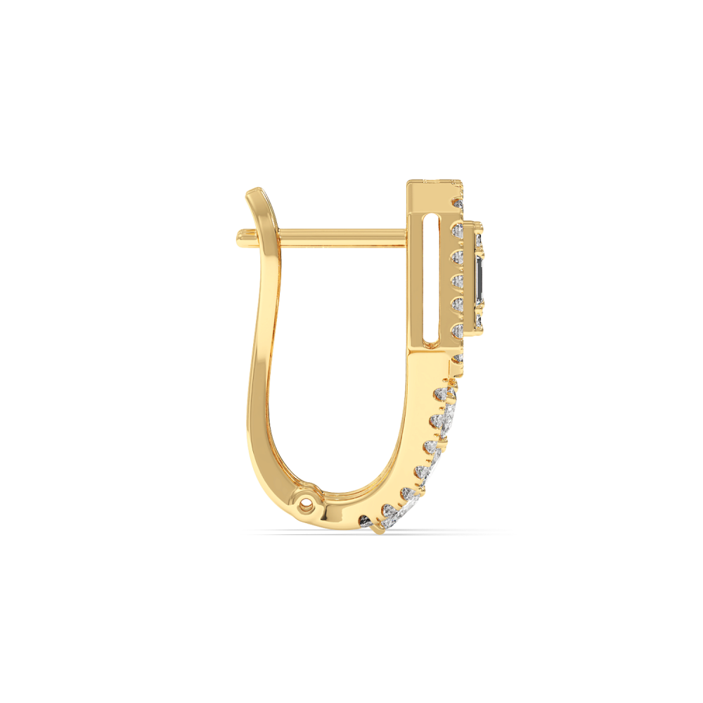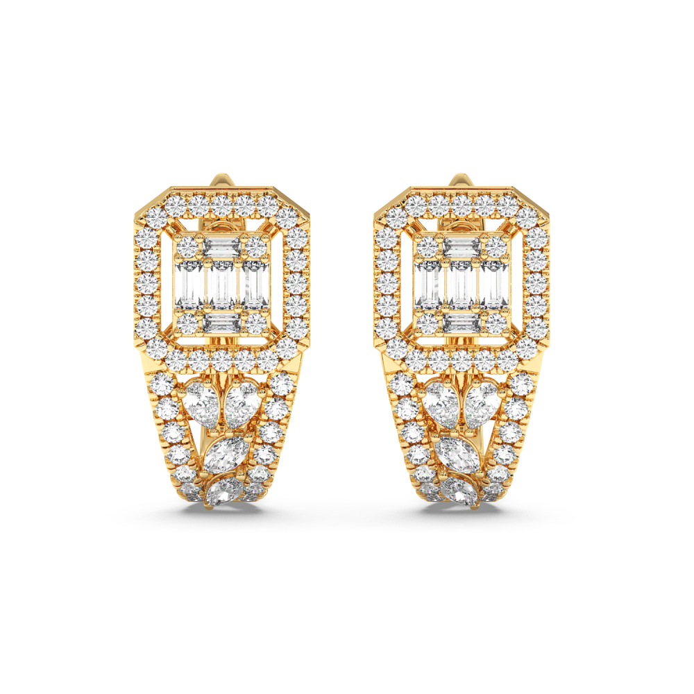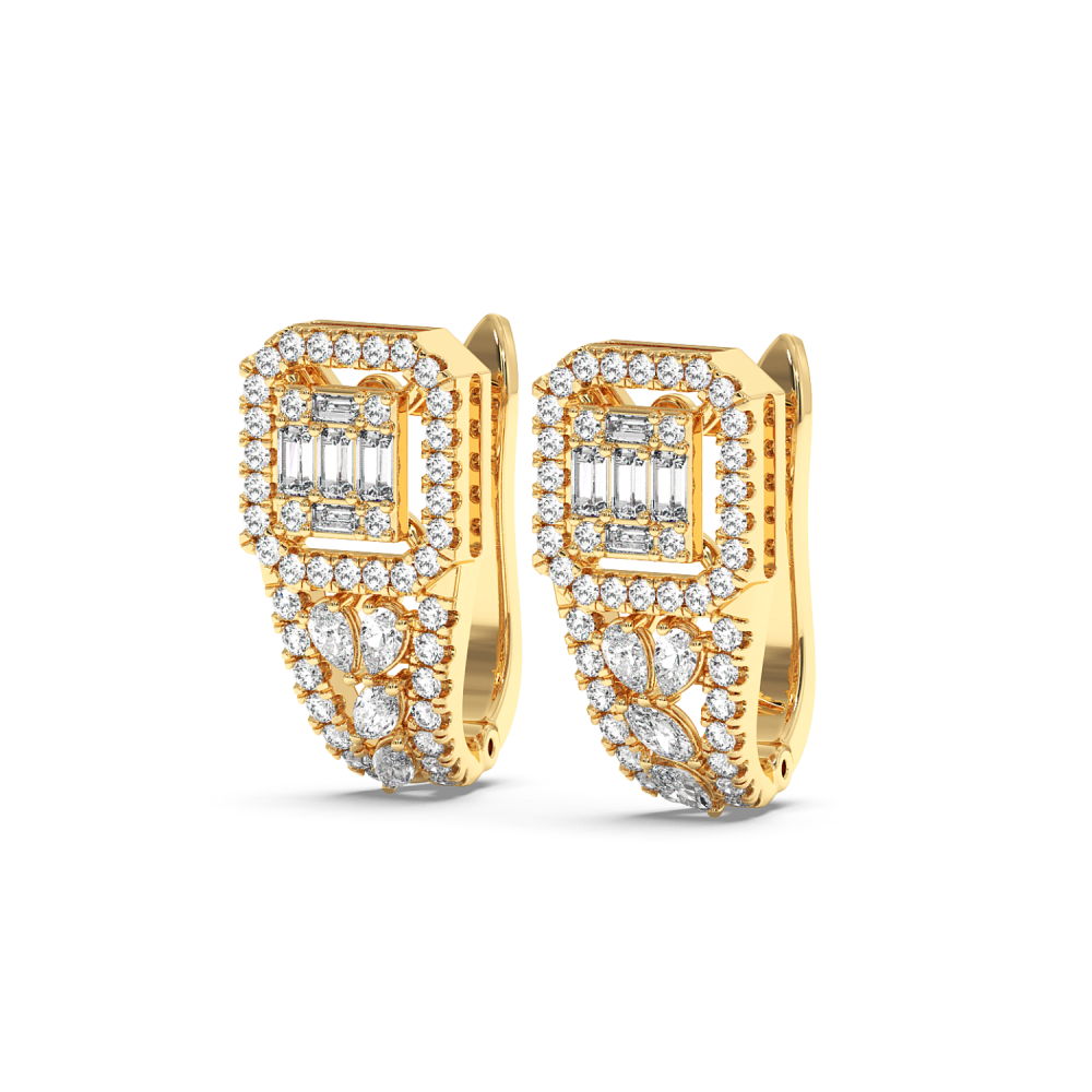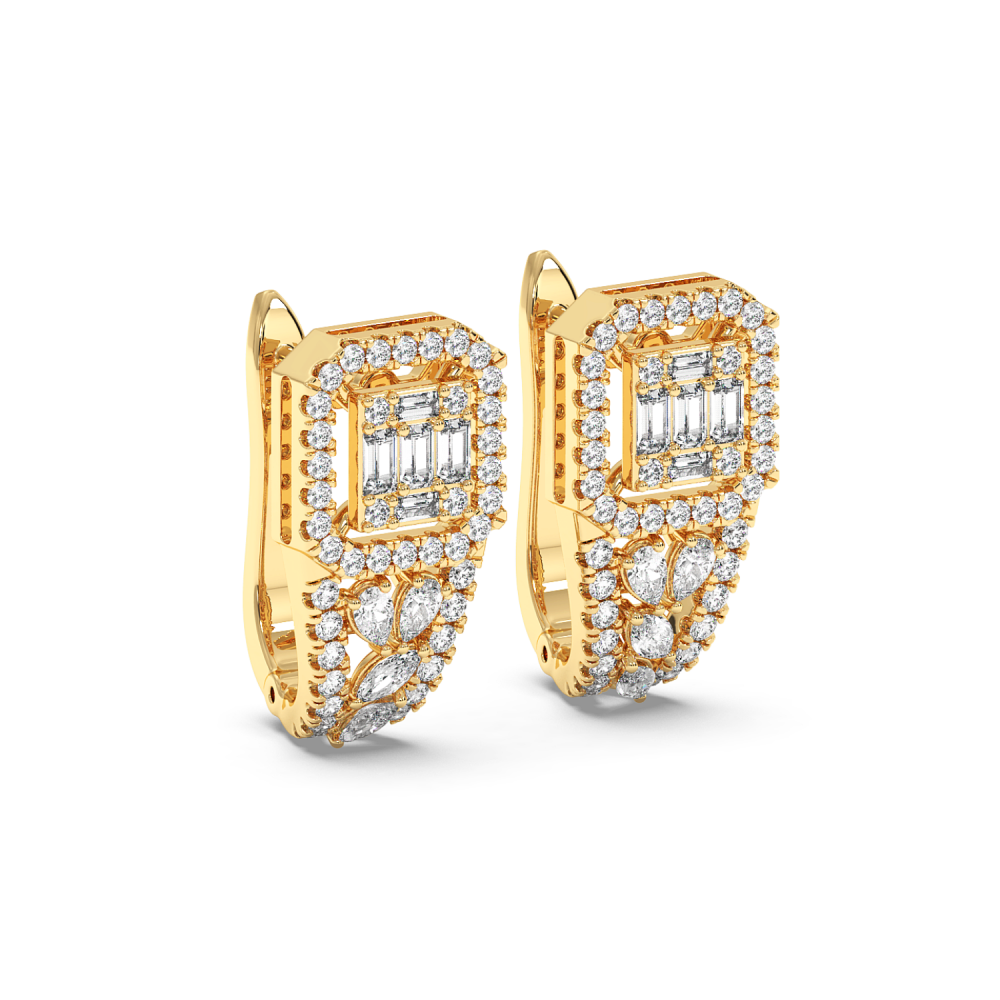Cercei din aur de 14 K, cu diamante rotunde de 0.45ct, diamante baget de 0.22ct, diamante Pear Cut de 0.14ct si diamante Marquise Cut de 0.14ct. Greutatea cerceilor este de aproximativ 4.30 grame.