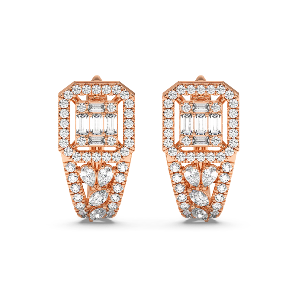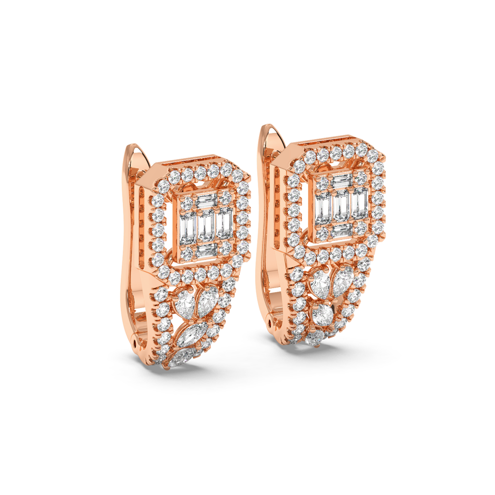 Cercei din aur de 14 K, cu diamante rotunde de 0.45ct, diamante baget de 0.22ct, diamante Pear Cut de 0.14ct si diamante Marquise Cut de 0.14ct. Greutatea cerceilor este de aproximativ 4.30 grame.