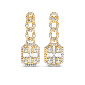 Cercei din aur de 14 K, cu diamante rotunde de 1.64ct, diamante baget de 0.80ct si diamante EMerald Cut de 0.40ct. Greutatea cerceilor este de aproximativ 8.80 grame.