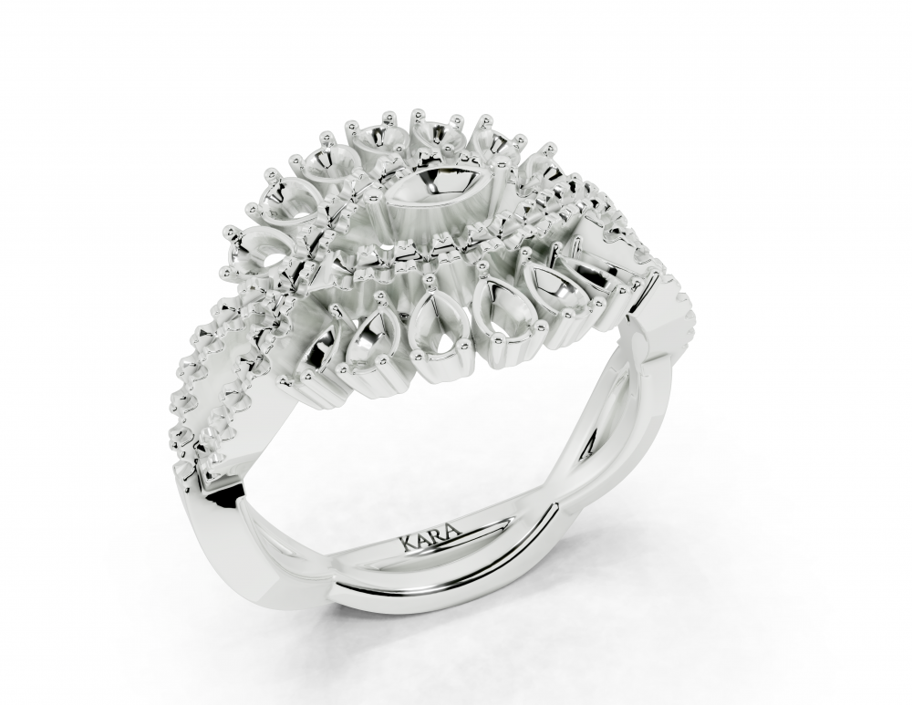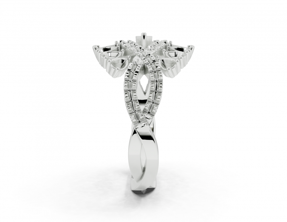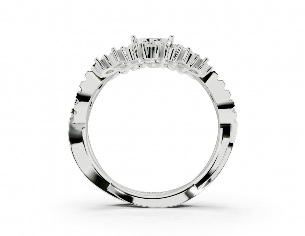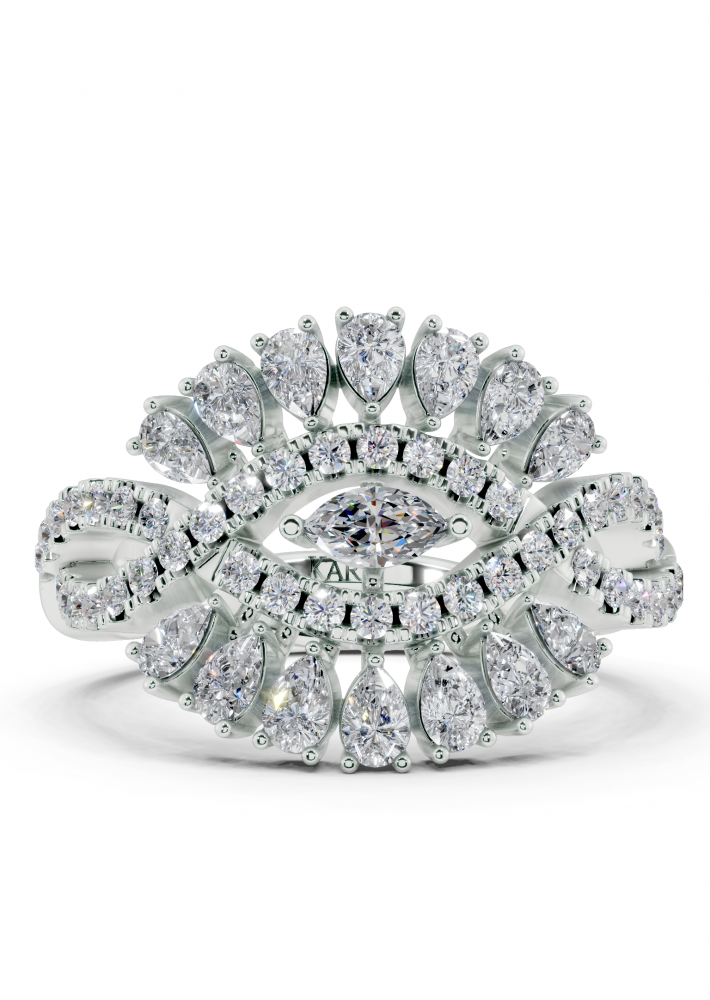 Inel din aur alb de 14K, cu diamant central Marquise Cut de 0.07ct, diamante Pear Cut de 0.72ct si diamante rotunde de 0.32ct. Greutatea inelului este de aproximativ 6 grame. Inelul se poate face pe comanda si din aur de 18K. Putem modifica design-ul in functie de bugetul dumneavoastra.