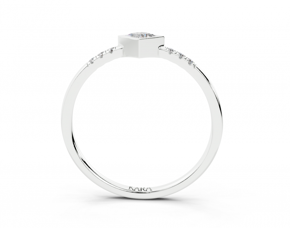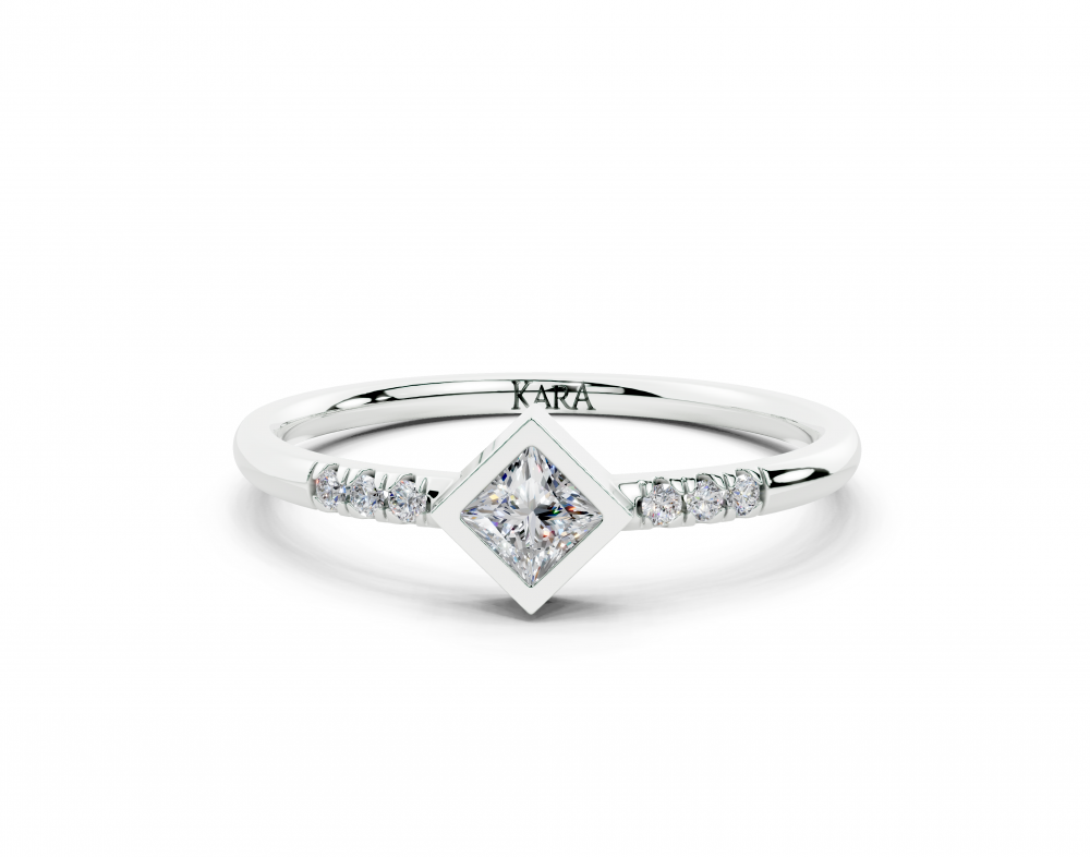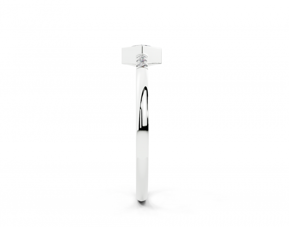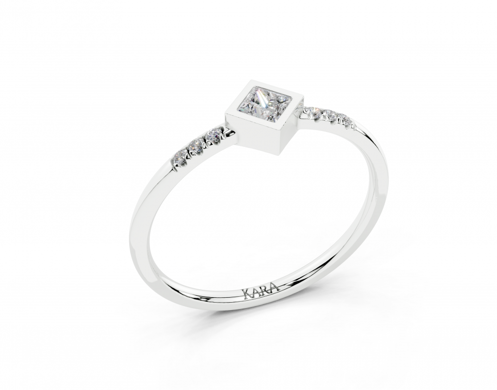 Inel din aur alb de 14K, cu diamant central Princess Cut de 0.17ct si diamante rotunde de 0.04ct. Greutatea inelului este de 1.55 grame.