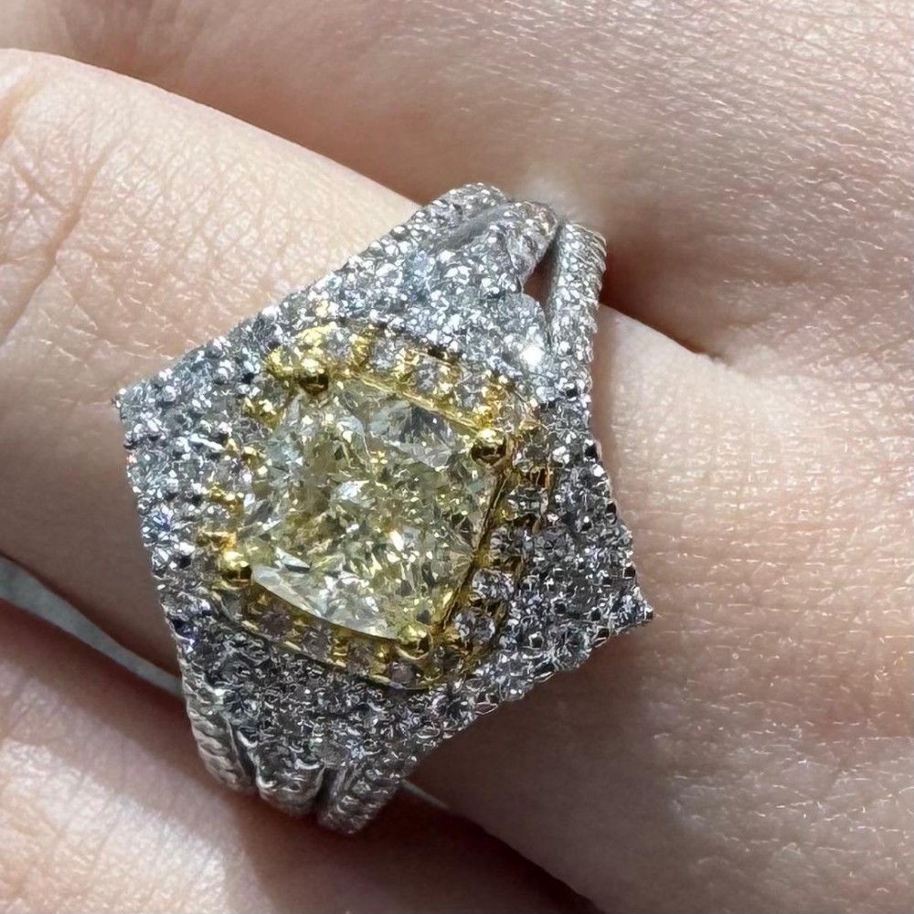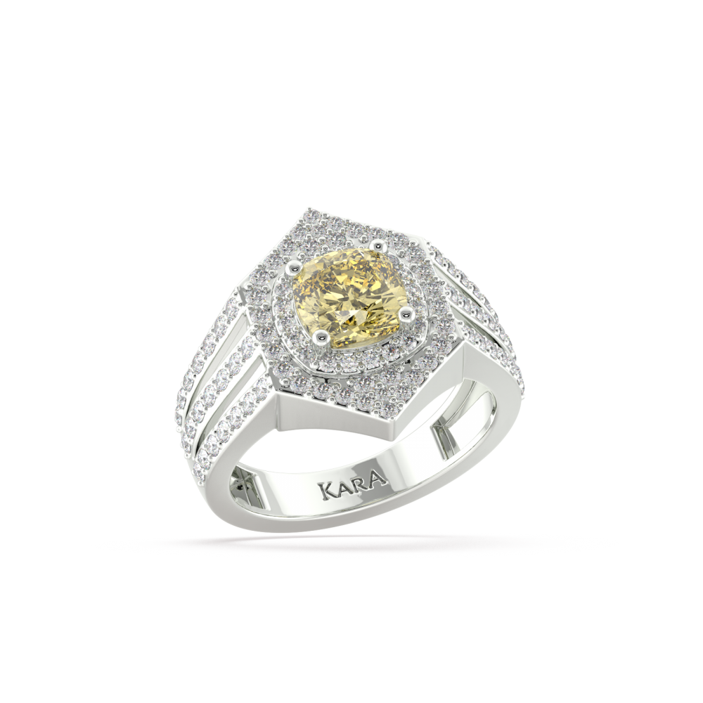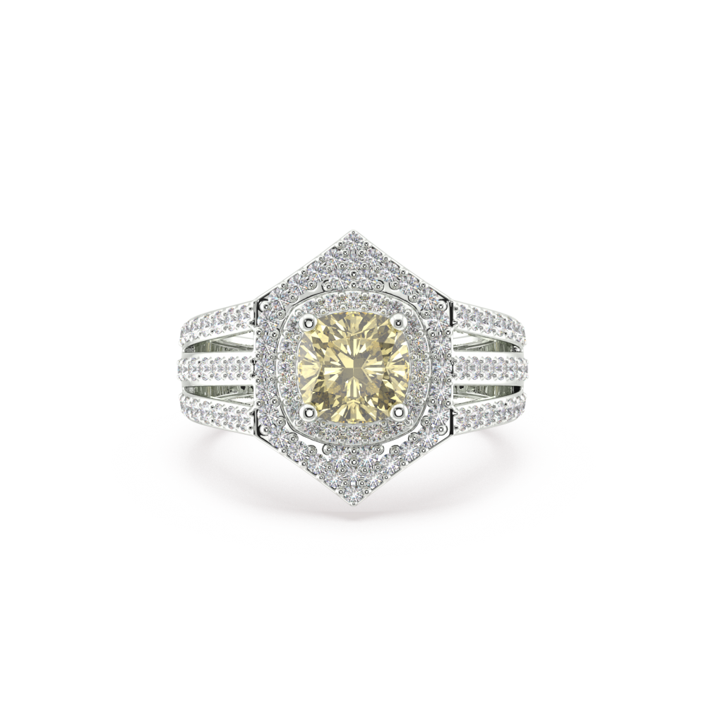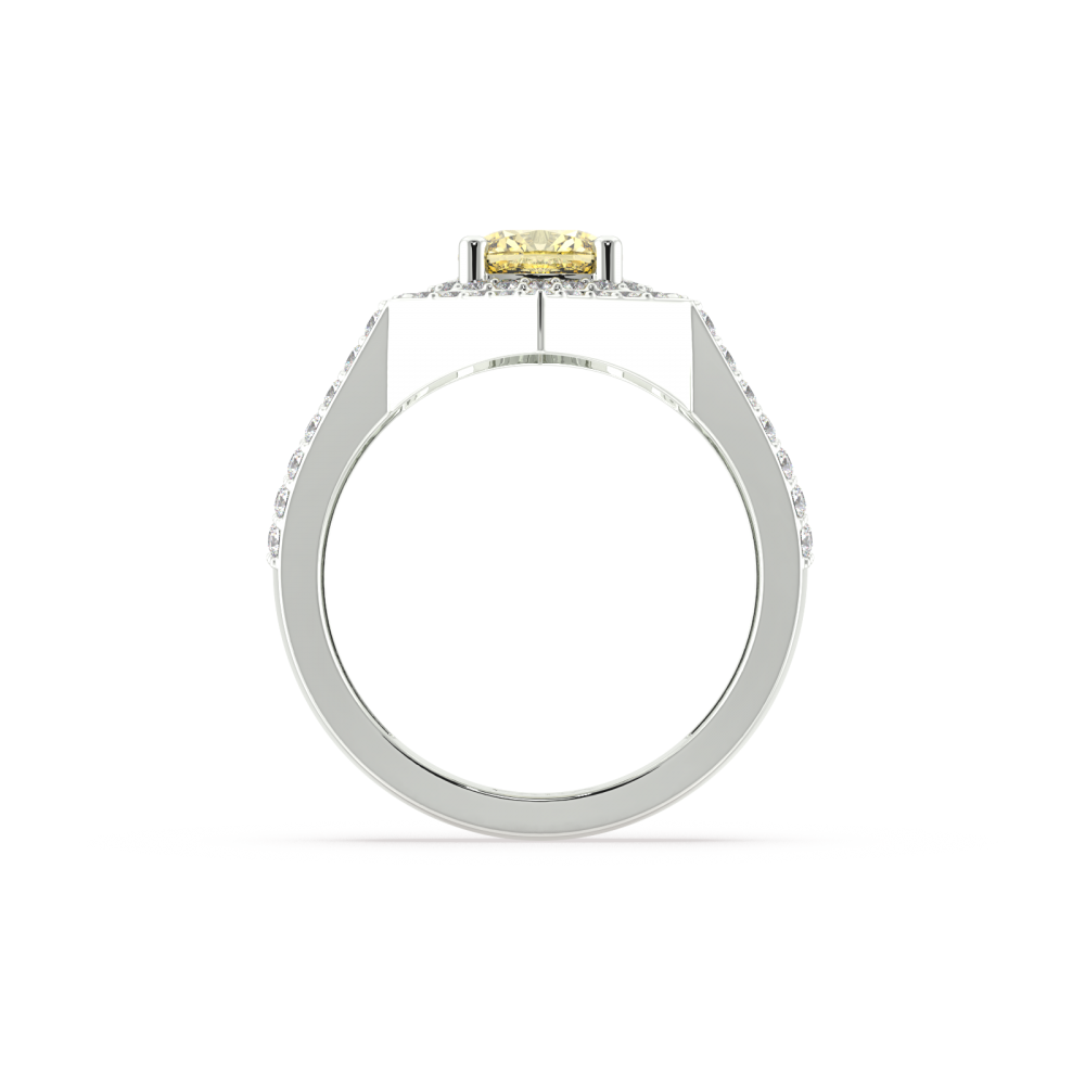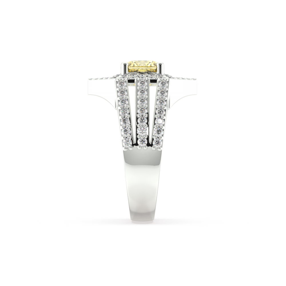 Inel din aur alb de 14 K, cu diamant Fancy de 1.52 ct si diamante rotunde de 1.13 ct. Greutatea inelului este de 7.12 grame. Inelul se poate face pe comanda si din aur de 18K. Putem modifica design-ul in functie de bugetul dumneavoastra
