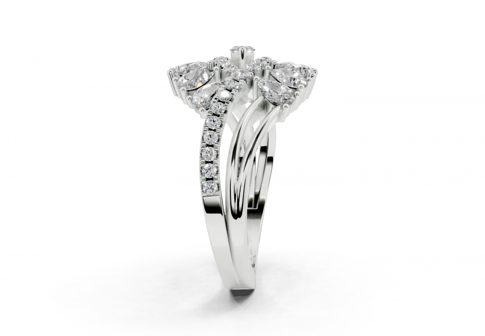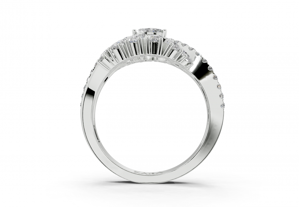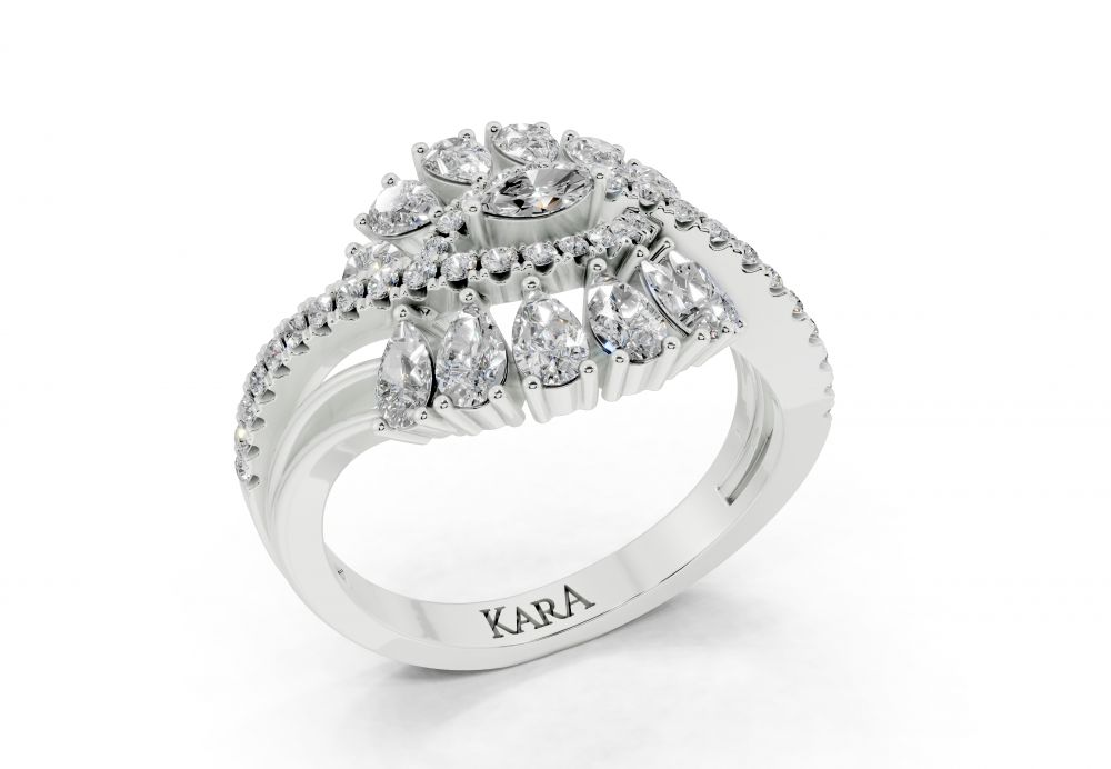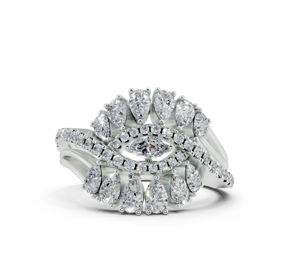 Inel din aur alb de 14K, cu un diamant central Marquise Cut de 0.06ct, diamante Pear Cut de 0,80ct si ediamante rotunde de 0.19ct. Greutatea inelului este de aproximativ 3.50 grame. Inelul se poate face pe comanda si din aur de 18K. Putem modifica design-ul in functie de bugetul dumneavoastra.