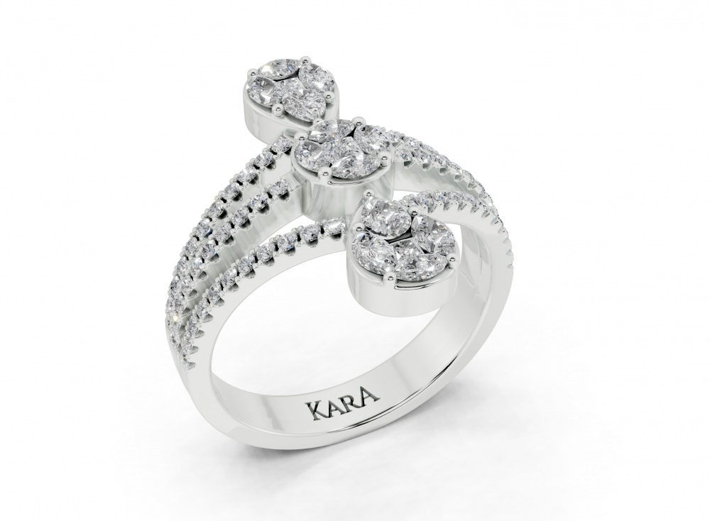 Inel din aur alb de 14K, cu diamante Marquise Cut de 0.29ct, diamante Pear Cut de 0.12ct, diamante Princess Cut de 0.13ct si diamante rotunde de 0.32ct. Greutatea inelului este de aproximativ 4.50 grame.