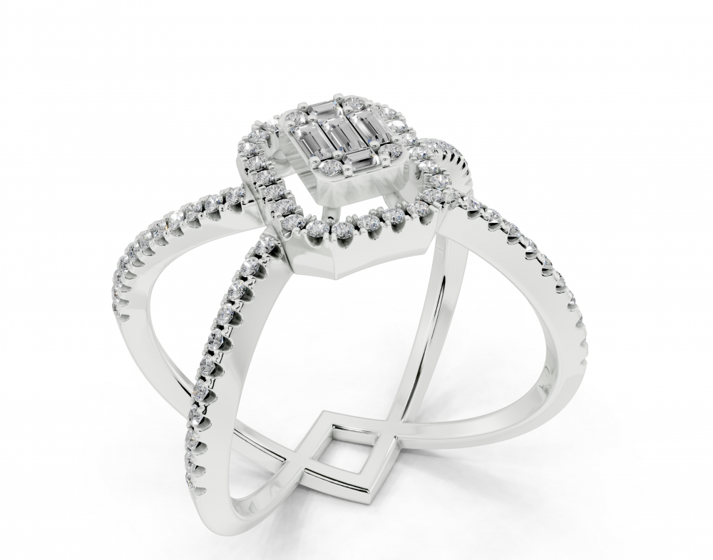 Inel din aur alb de 14K, cu diamante Baget Cut de 0.11ct si diamante rotunde de 0.27ct. Greutatea inelului este de aproximativ 4.00 grame.
