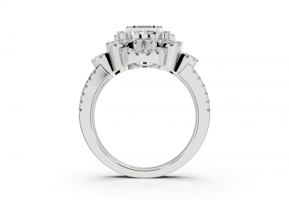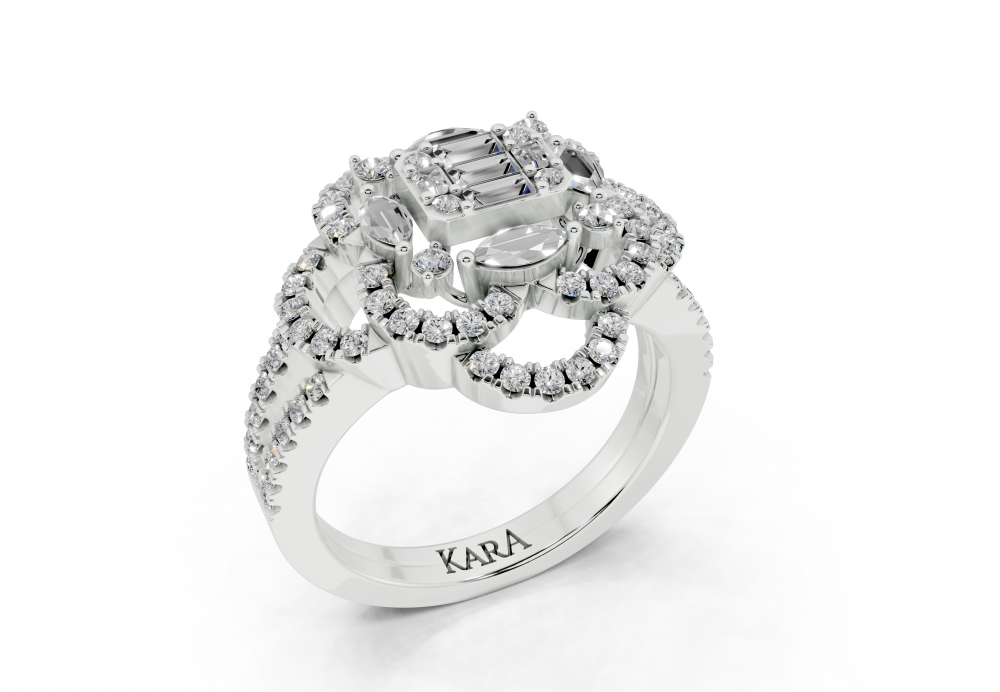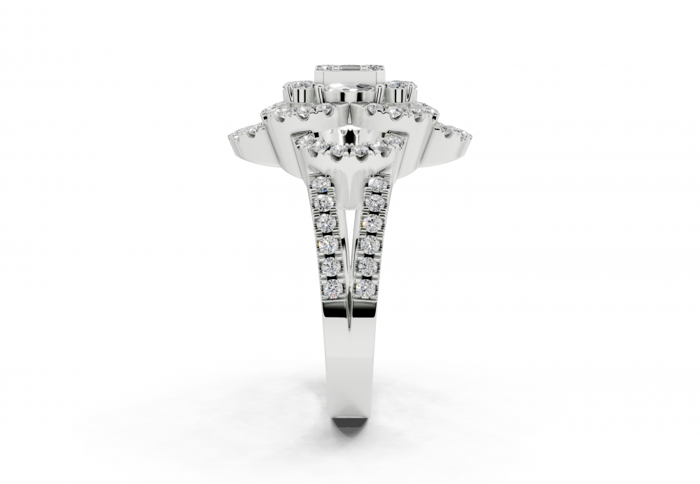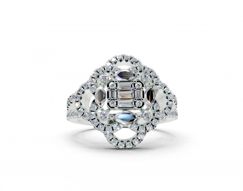 Inel din aur alb de 14K, cu diamante Baget de 0.13ct, diamante Marquise Cut de 0.18ct si diamante rotunde de 0.50ct. Greutatea inelului este de aproximativ 5grame.