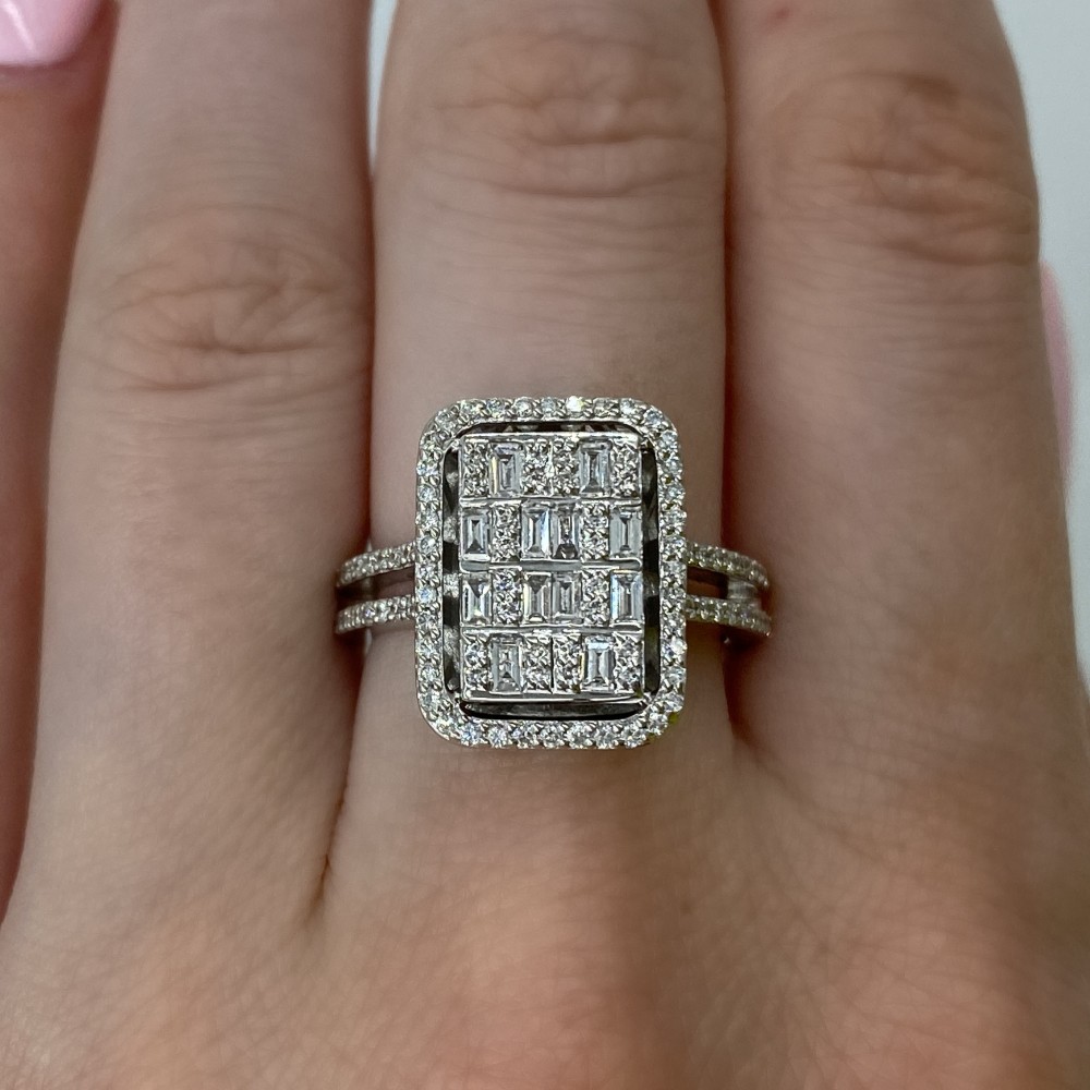 Inel din aur alb de 14K cu diamante Baget de 0.30 ct si diamante rotunde de 0.42 ct. Greutatea inelului este de aproximativ 6,29 grame. Inelul se poate face pe comanda si din aur de 18K. Putem modifica design-ul in functie de bugetul dumneavoastra. Putem alege caracteristicile diamantelor...