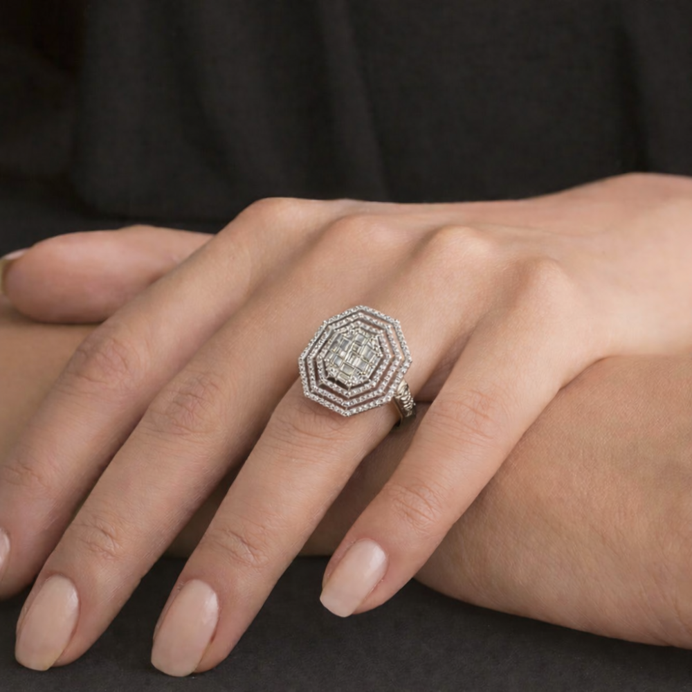 Inel din aur alb de 14 k, cu diamante Baget de 0,55 ct si diamante rotunde de 1.08 ct. Greutatea inelului este de 8.59 grame. Inelul se poate face pe comanda si din aur de 18K. Putem modifica design-ul in functie de bugetul dumneavoastra. Putem alege caracteristicile diamantelor (taietura,...