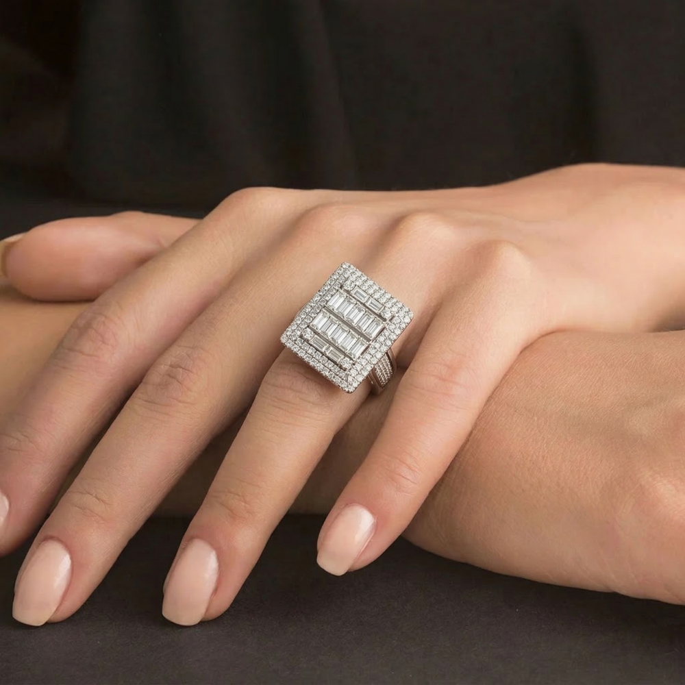 Inel cu diamante bagheta din aur alb de 18K, diamante Baget de 1.04 ct si diamante rotunde de 0.92 ct. Greutatea aproximativa a inelului este de 11.90 grame.