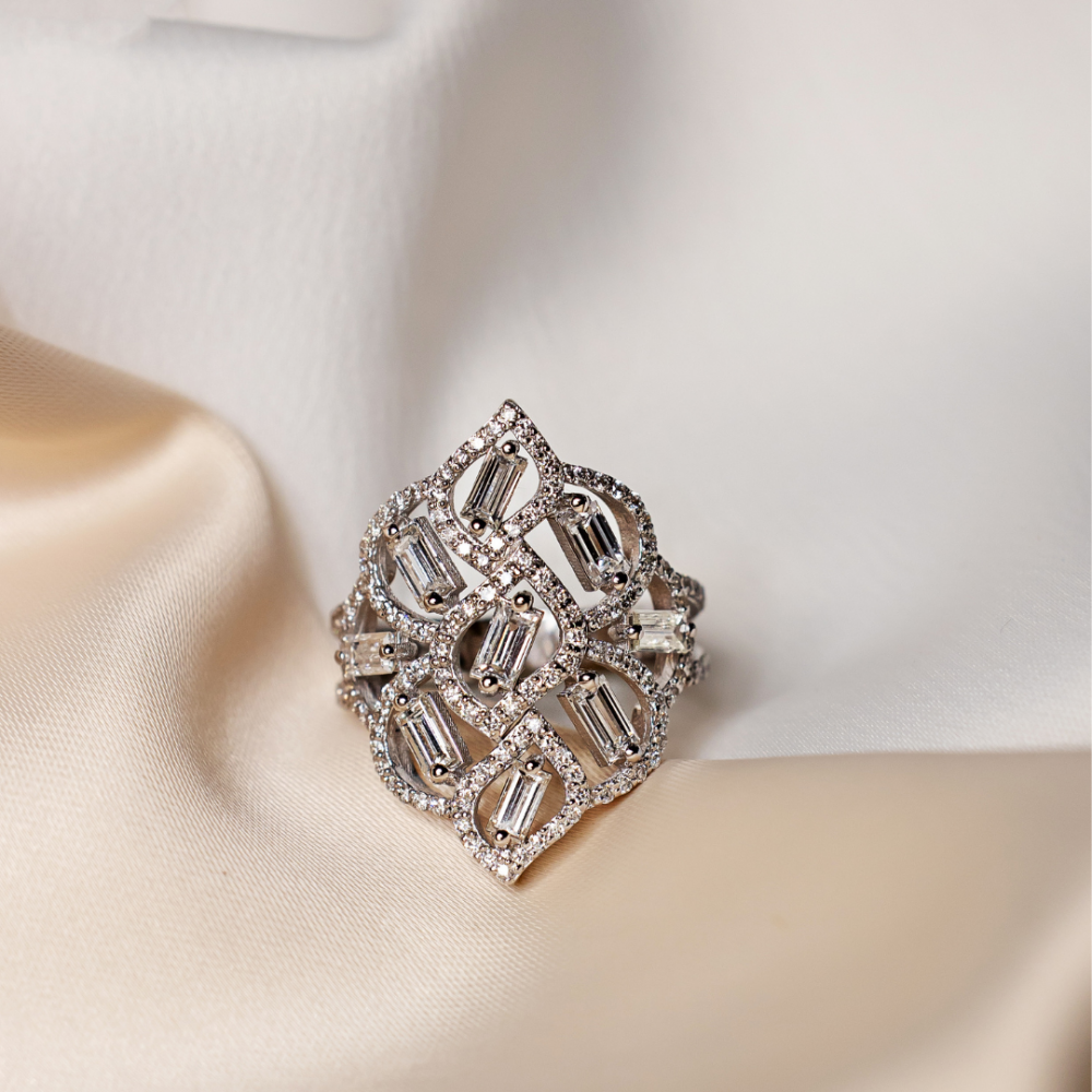 Inel din aur alb de 18 K, cu diamante Baget de 1.38 ct si diamante rotunde de 0.74 ct. Greutatea inelului este de 7.69 grame.