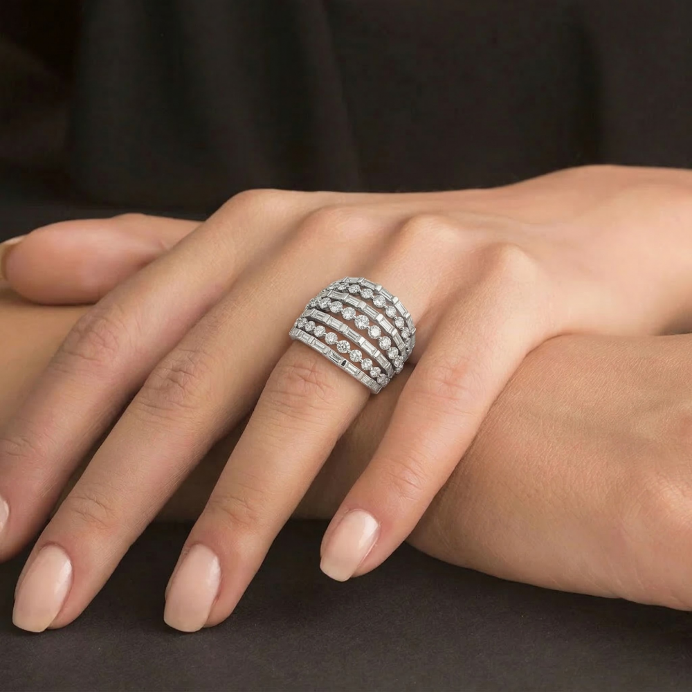 Inel cu diamante bagheta din aur alb de 18K, diamante Baget de 1.79 ct si diamante rotunde de 1.70 ct. Greutatea aproximativa a inelului este de 10.46 grame. Inelul se poate face pe comanda si din aur de 14K. Putem modifica design-ul in functie de bugetul dumneavoastra. Putem alege...