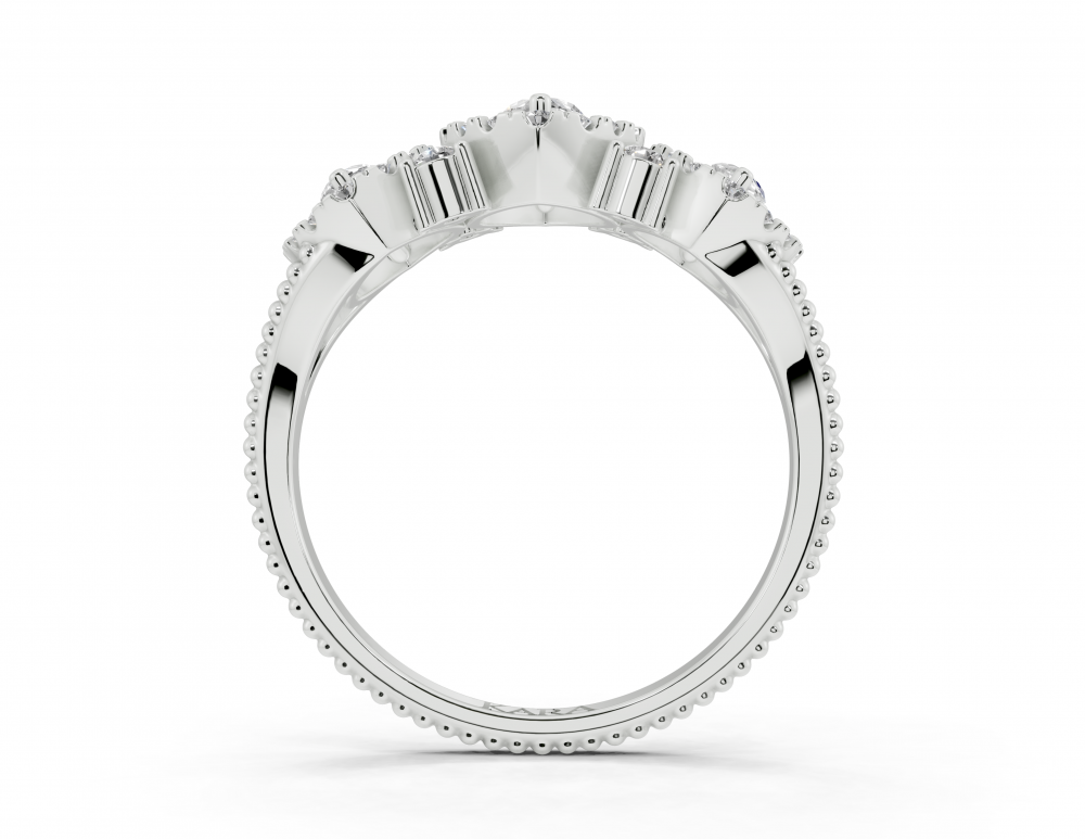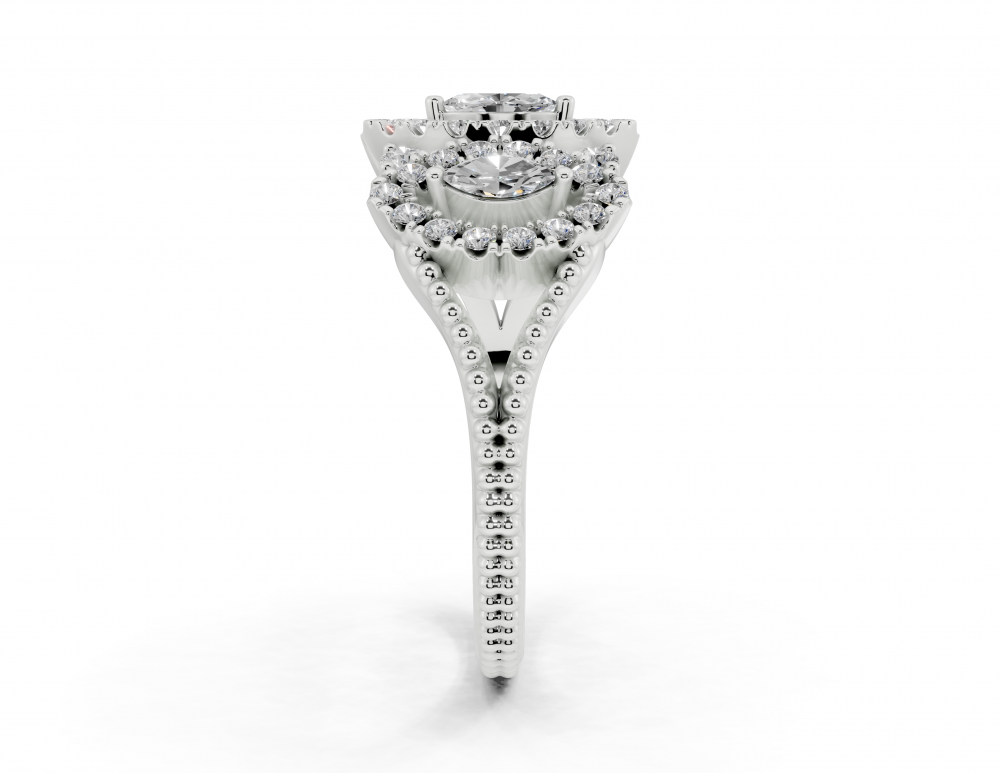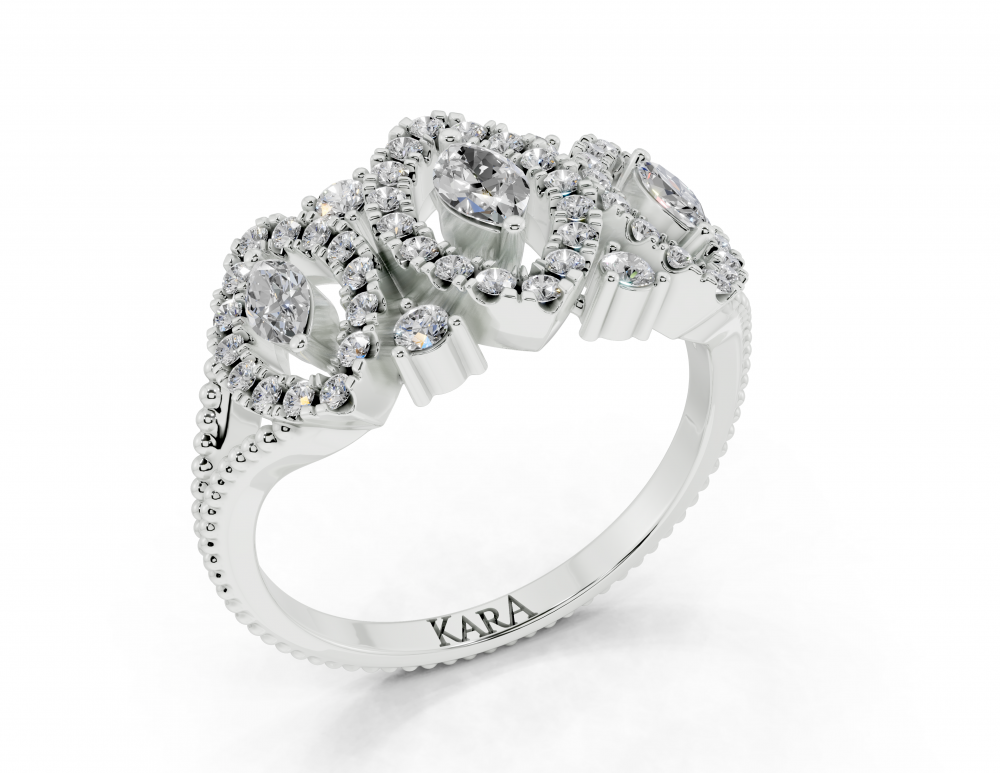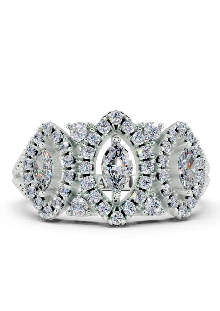 Inel din aur alb de 14K, cu diamante centrale Marquise Cut de 0.21ct si diamante laterale rotunde de 0.33ct. Greutatea inelului este de aproximativ 4 grame. Inelul se poate face pe comanda si din aur de 18K. Putem modifica design-ul in functie de bugetul dumneavoastra.