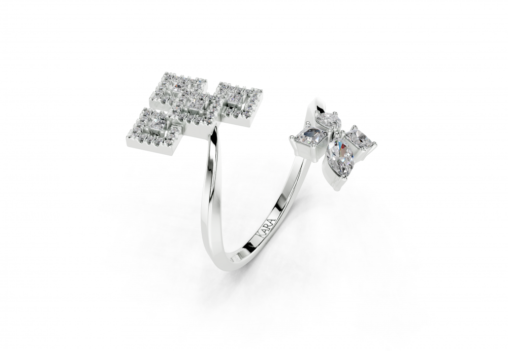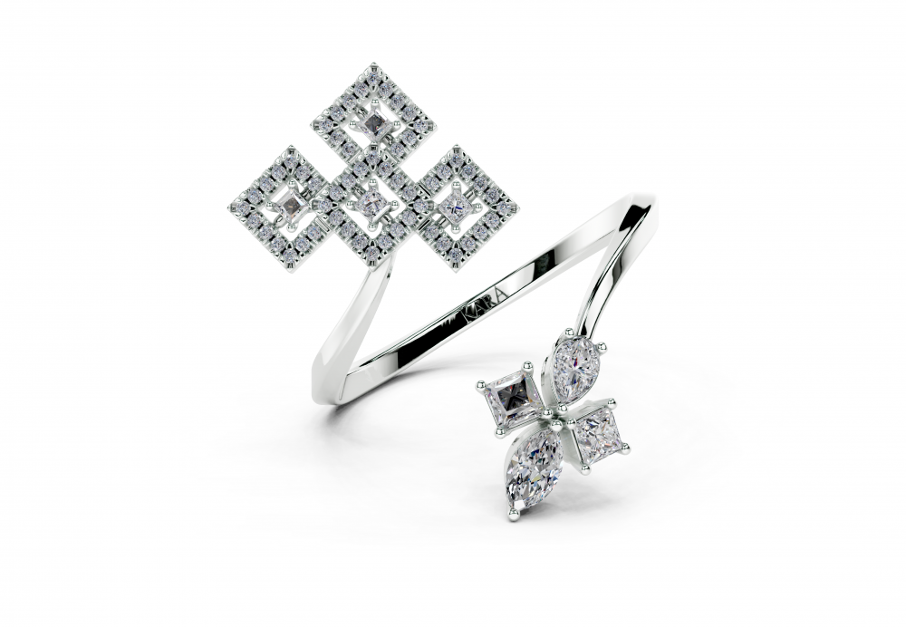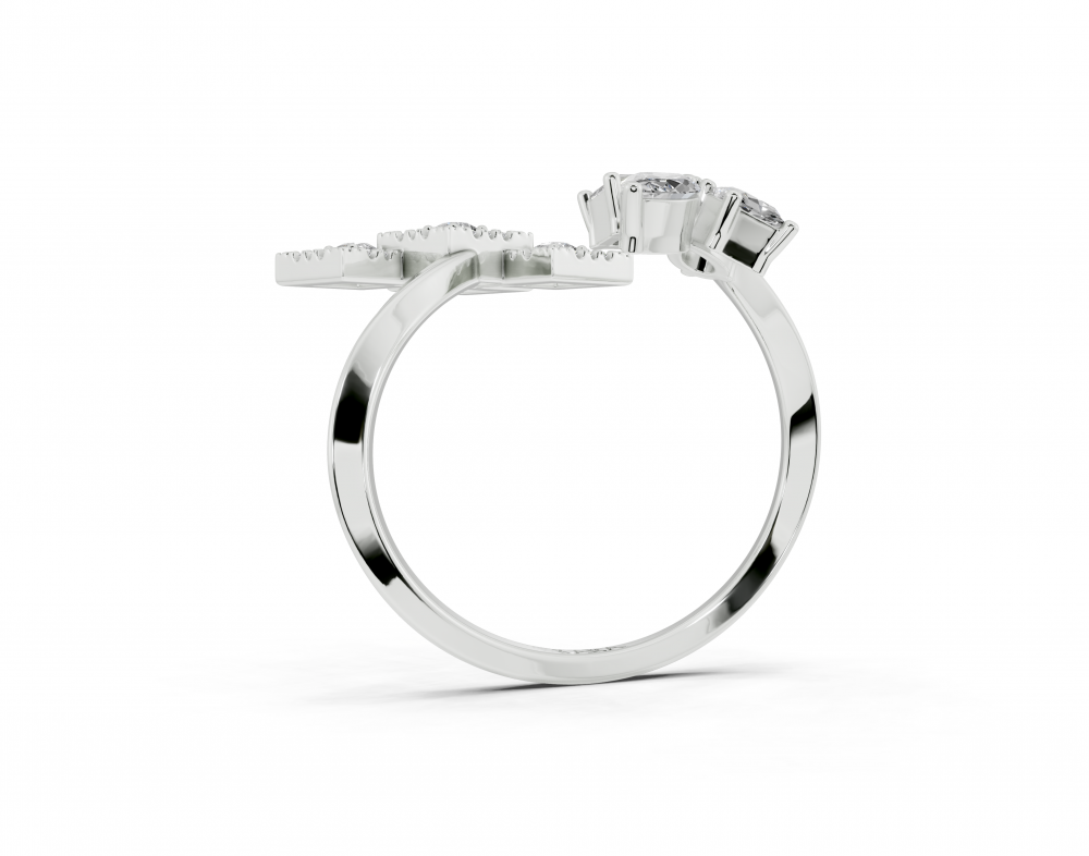 Inel din aur alb de 14K, cu diamante Princess Cut de 0.31ct, un diamant Marquise Cut de 0.11ct, un diamant Pear Cut de 0.09ct si diamante rotunde de 0.11ct. Greutatea inelului este de aproximativ 3.30 grame.