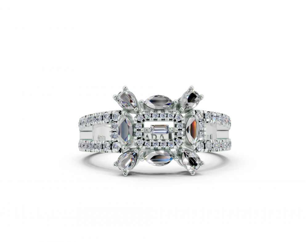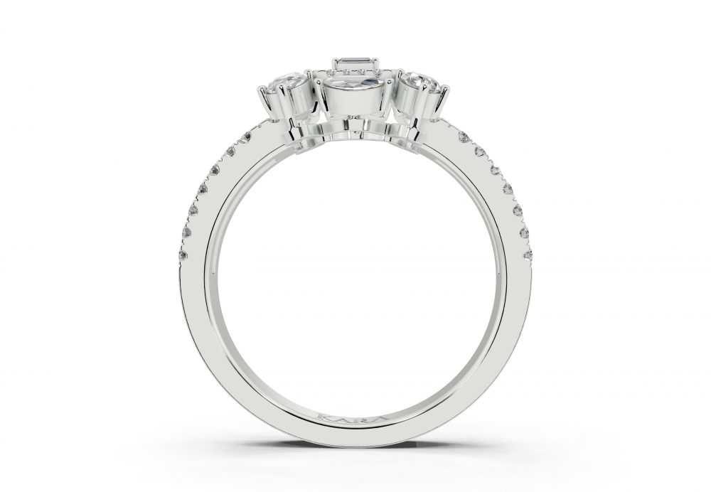 Inel din aur alb de 14K, cu diamante Pear Cut de 0.21ct, diamante Marquise Cut de 0.15ct, diamante Baget de 0.01ct si diamante rotunde de 0.26ct. Greutatea inelului este de aproximativ 4 grame.
