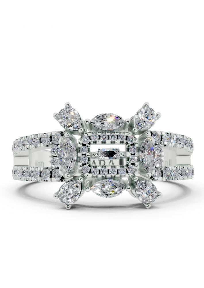 Inel din aur alb de 14K, cu diamante Pear Cut de 0.21ct, diamante Marquise Cut de 0.15ct, un diamant Baget de 0.01ct si diamante rotunde de 0.26ct. Greutatea inelului este de aproximativ 4 grame.