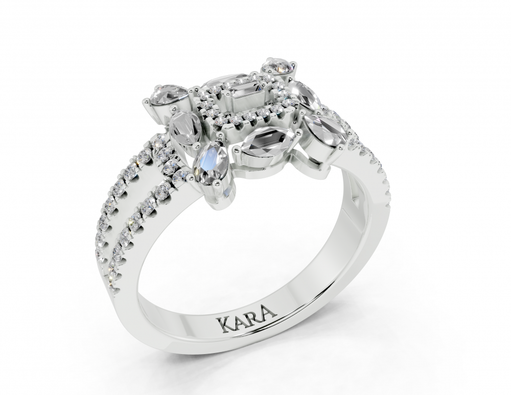 Inel din aur alb de 14K, cu diamante Pear Cut de 0.21ct, diamante Marquise Cut de 0.15ct, un diamant Baget de 0.01ct si diamante rotunde de 0.26ct. Greutatea inelului este de aproximativ 4 grame. Inelul se poate face pe comanda si din aur de 18K. Putem modifica design-ul in functie de bugetul...