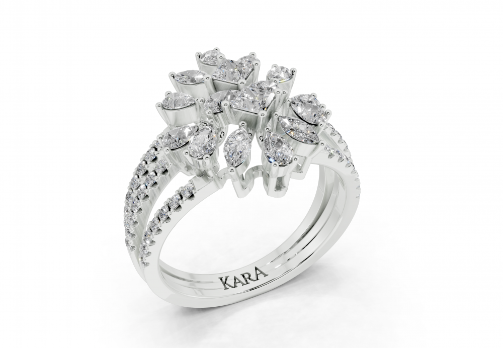 Inel din aur alb de 14K, cu diamante Pear Cut de 0.52ct, diamante Marquise Cut de 0.15ct, diamante Princess cut de 0.23ct si diamante rotunde de 0.27ct. Greutatea inelului este de aproximativ 4.50 grame.