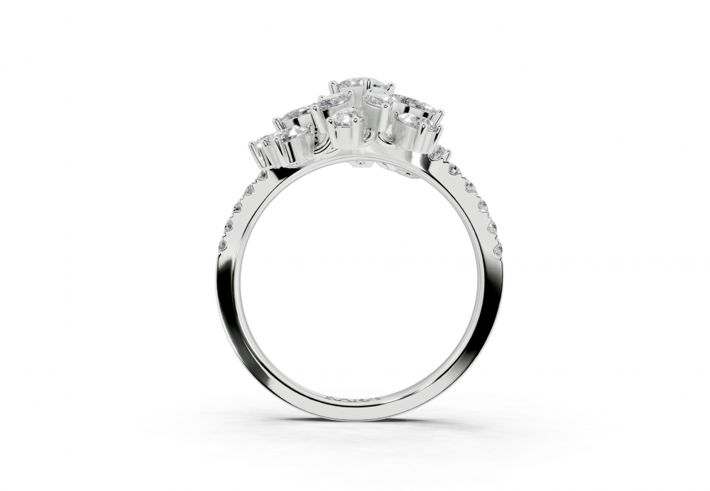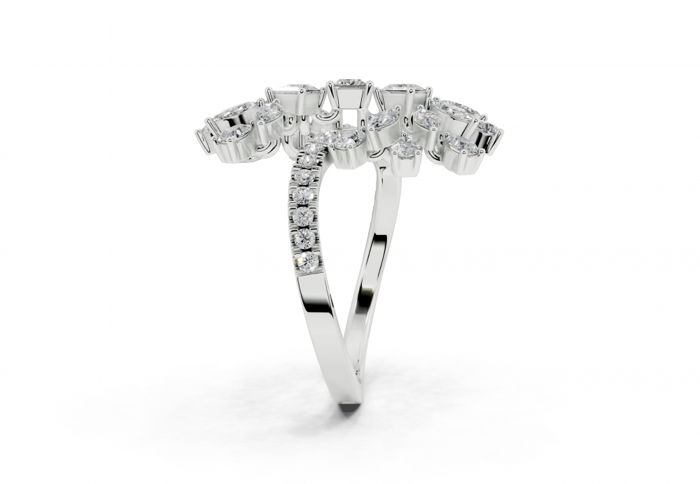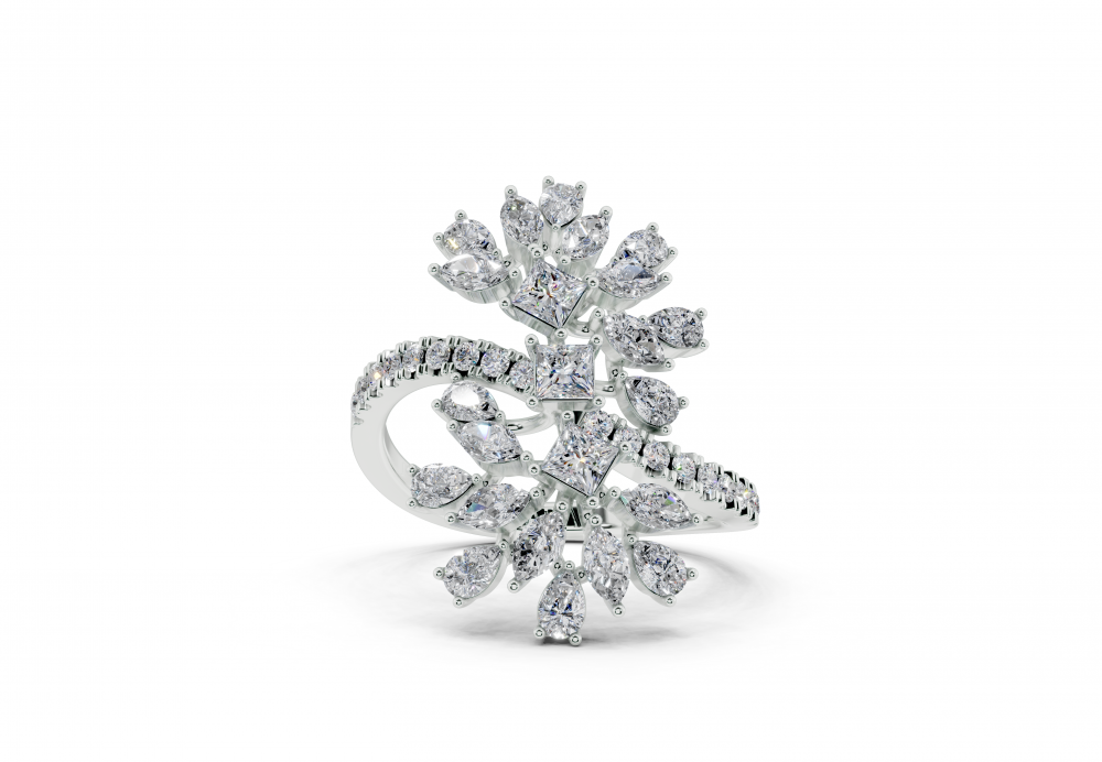 Inel din aur alb de 14K, cu diamante Marquise Cut de 0.37 ct, diamante Pear Cut de 0.52ct, diamante Princess Cut de 0.35ct si diamante rotunde de 0.19 ct. Greutatea inelului este de aproximativ 5 grame.