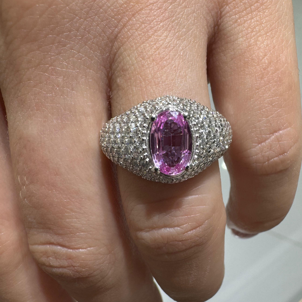 Inel din aur alb de 14 K, cu safir roz de 1.45 ct si diamante de 1.68 ct. Greutatea inelului este de 5.81 grame.